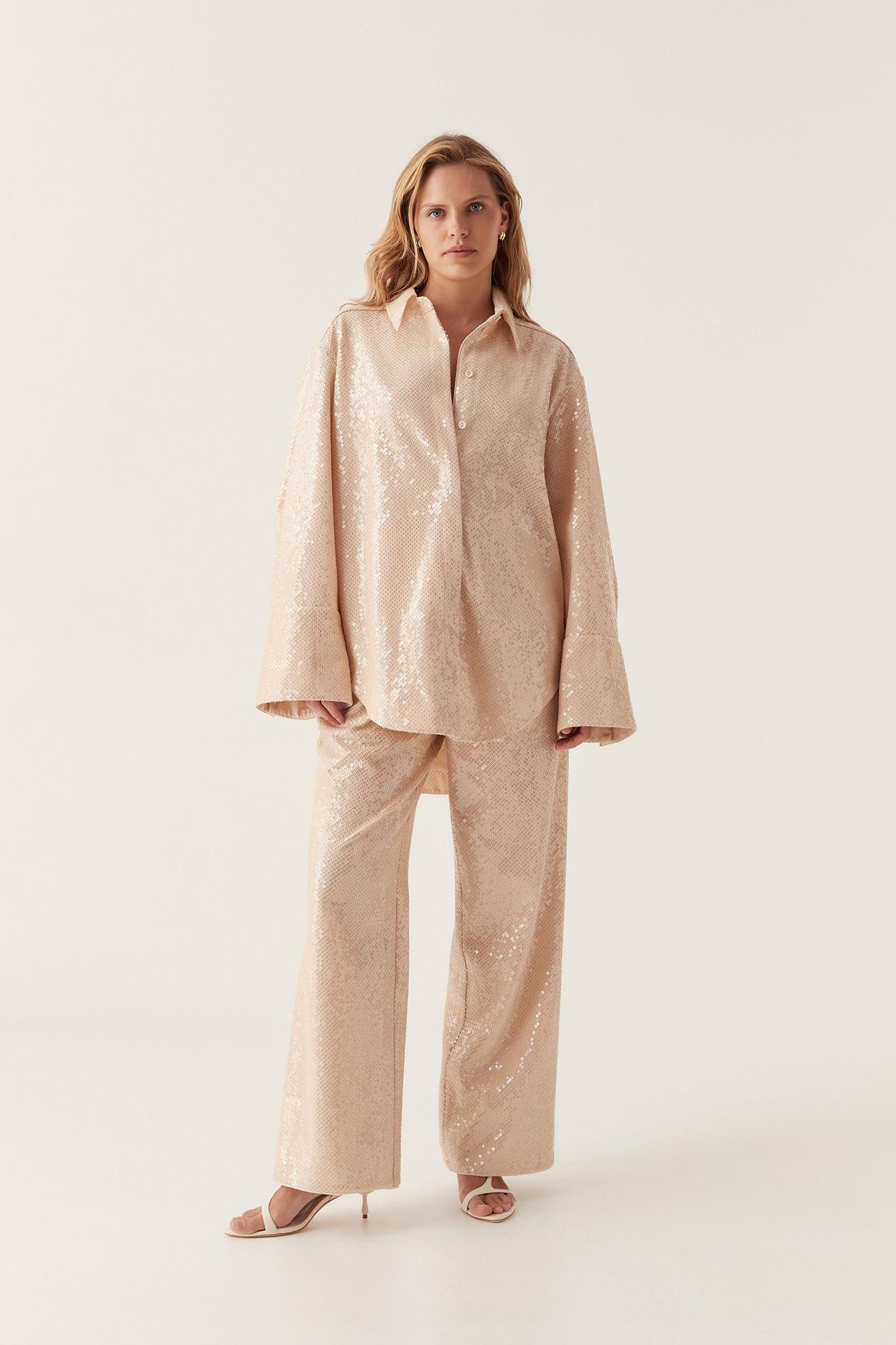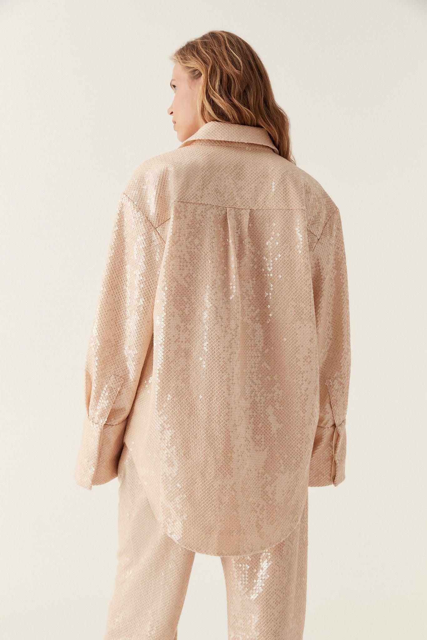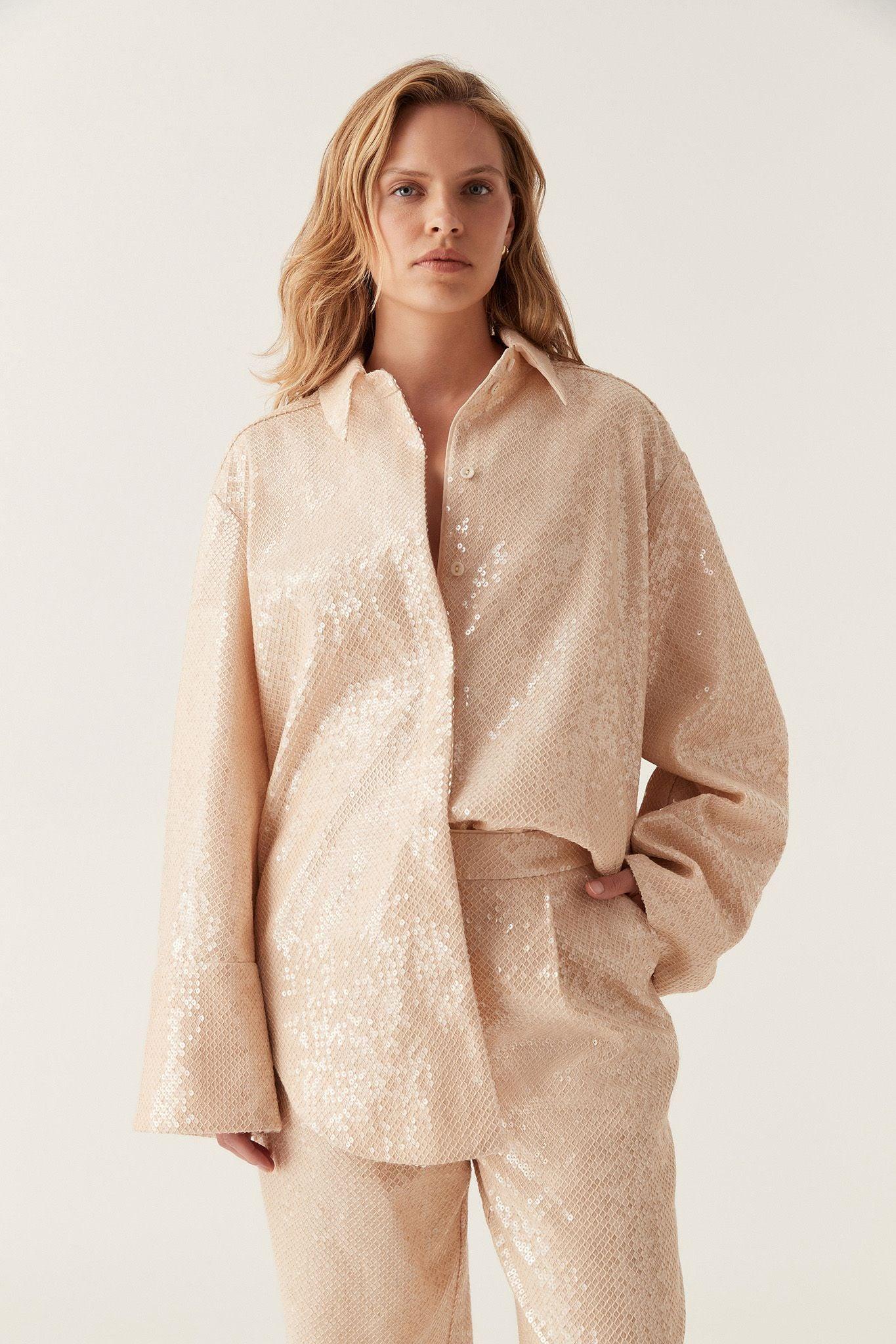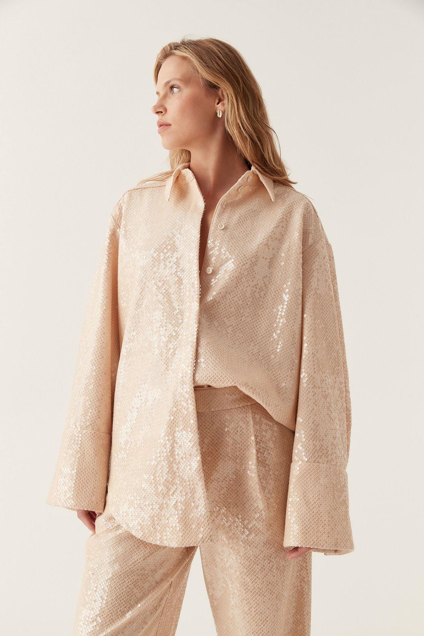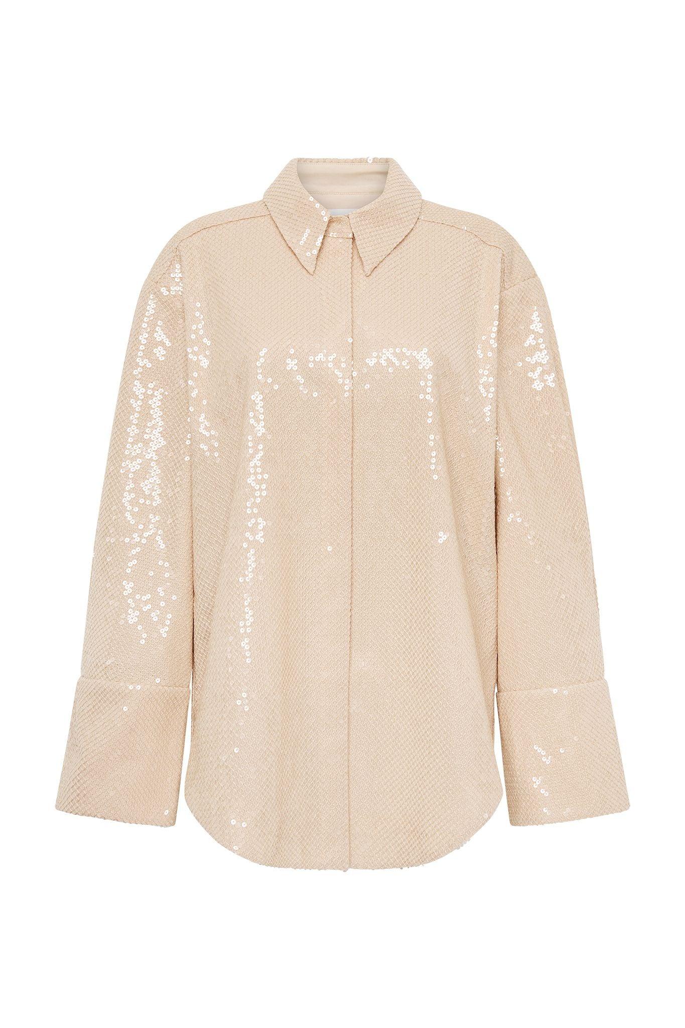 PRODUCT DETAILS Women's shirt Oversized fit Shirt collar Relaxed shoulders Long sleeves with wide, extended cuffs Concealed front button-up placket Curved hem Sequin embellishment throughout Shop All Tops SIZE AND FIT Model wears a size 8/S Model: 181cm/ 5’11 Bust: 83cm Waist: 64cm Hips: 97cm FABRICATION 100% Polyester Dry Clean Only