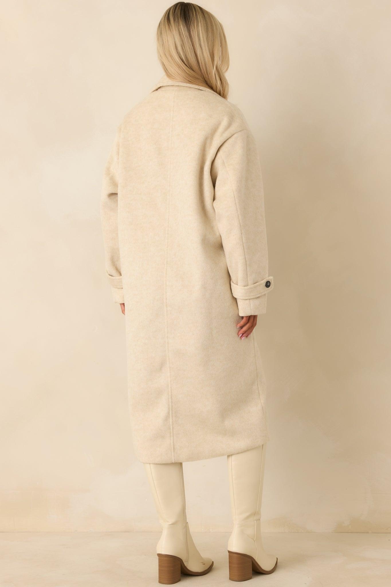 Some pieces just feel right from the start. Inclined to Agree Ivory Felted Wool Blend Longline Coat is the kind of layer you instinctively reach for, thanks to its soft felted texture and relaxed longline silhouette that brings effortless polish to any look. The creamy ivory hue keeps things timeless and wearable, while subtle tailoring details give it a thoughtful, refined finish. It’s an easy yes for crisp mornings, dressed-up errands, and anywhere you want to feel comfortable and confidently put together. This ivory longline coat is made from a soft felted wool-blend fabric with a smooth, lightly structured hand feel. It features a simple double-breasted button closure, an open collar neckline, and long sleeves finished with buttoned cuffs. The relaxed fit is balanced with a back belt detail for gentle shape, while functional side pockets add everyday practicality.70% Polyester, 25% Wool, & 5% SpandexLining: 100% PolyesterHand Wash ColdManufactured in ChinaDesigned in the USAModel is 5'8" and wearing size x-small