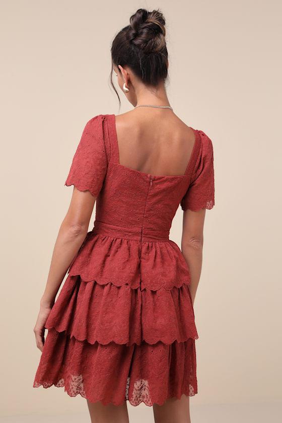You'll make your way into everyone's hearts when you're wearing the Lulus Inclined to Charm Rust Red Embroidered Tiered Lace-Up Mini Dress! Lightweight woven fabric, with an embroidered floral design throughout, shapes short sleeves (with scalloped cuffs) that frame a sweetheart neckline and a flatteringly seamed, bustier-style bodice with a lace-up detail at the front. Banded waist tops a tiered skirt that ends at a matching scalloped mini hem. Hidden zipper/clasp at back.