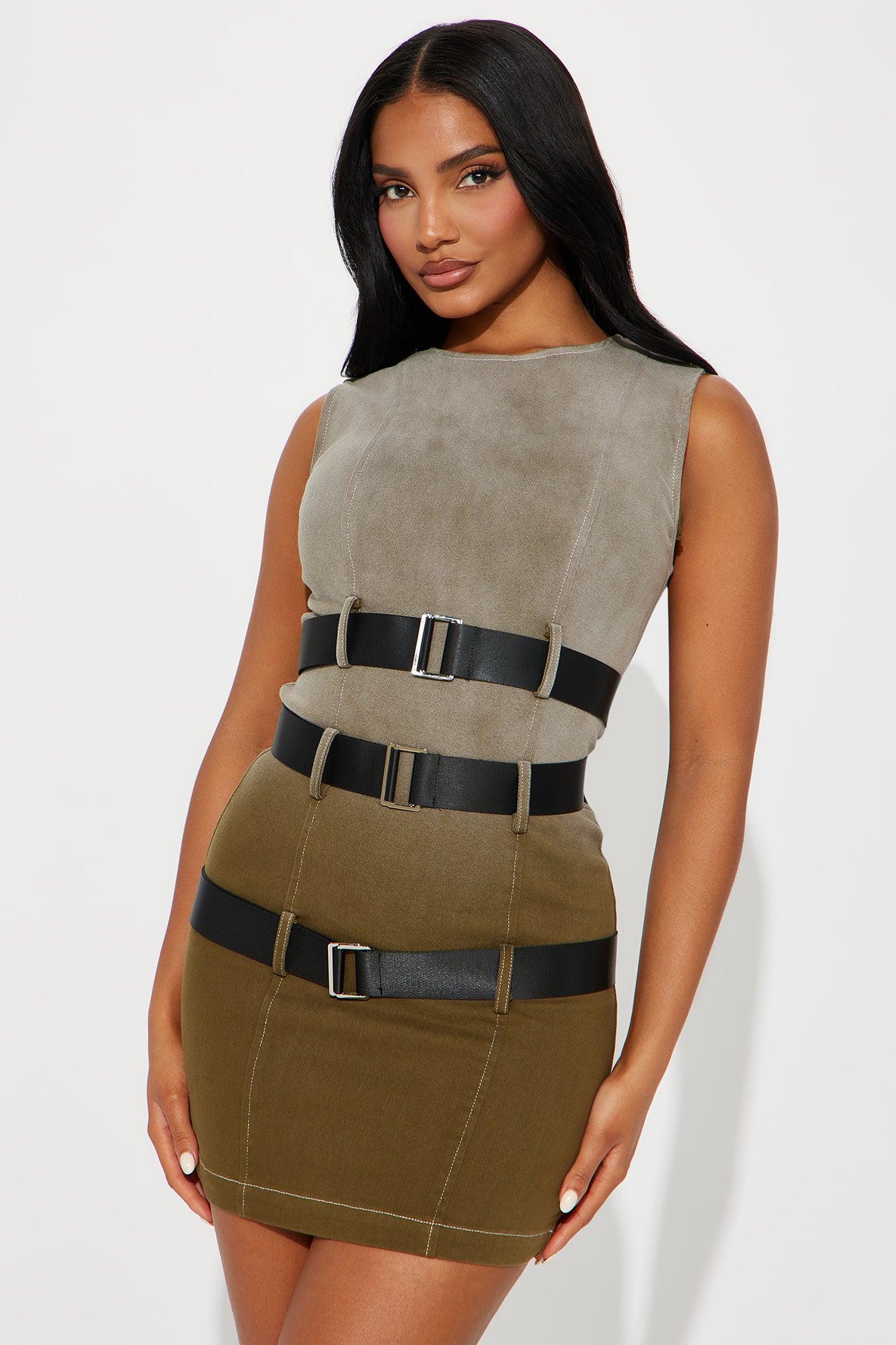 Available In Olive. Denim Mini Dress High Neckline Sleeveless Belted Detail Hidden Back Zipper Slight Stretch Length = 32" Self: 97% Cotton 3% Spandex Imported California Proposition 65 WARNING: Cancer and Reproductive Harm - www.P65Warnings.ca.gov.