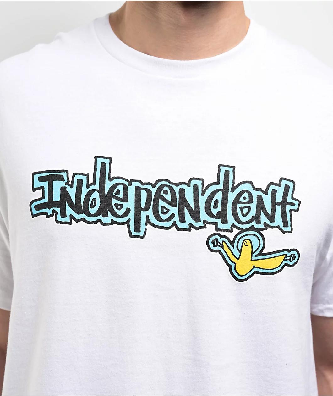 Independent collaborates with artist Mark Gonzales to present the Gonz Bar t-shirt. The white tee features blue and black branding on the chest alongside a yellow doodle of a smiling skate truck. The cotton construction ensures a comfortable feel.