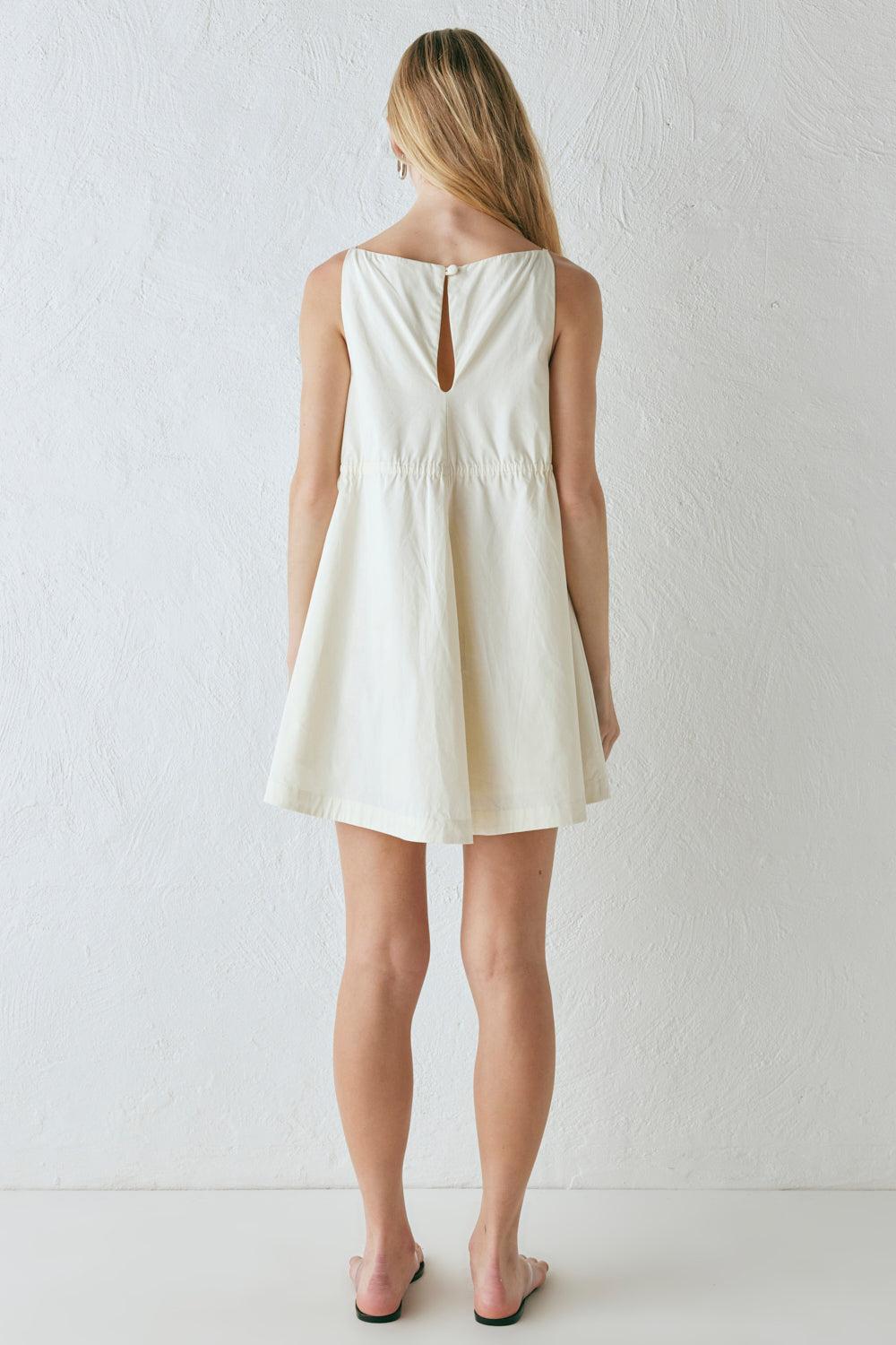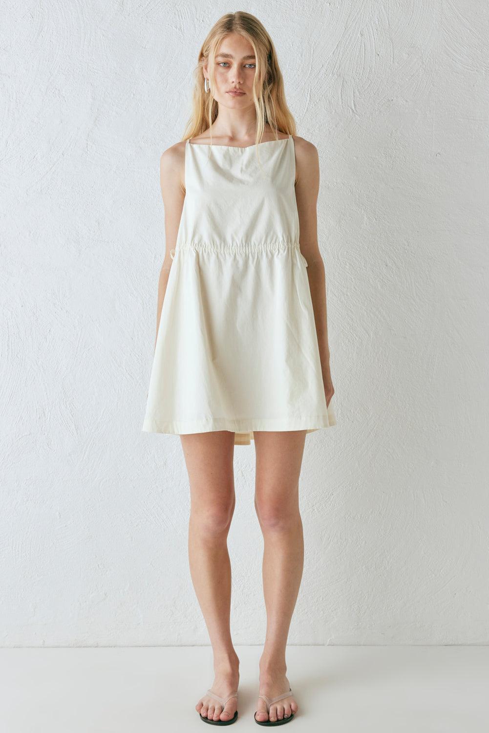 The Indi Mini Dress in Cream. Fully lined with ruched waist, adjustable drawstring ties, and back keyhole with button closure. Designed in Australia.