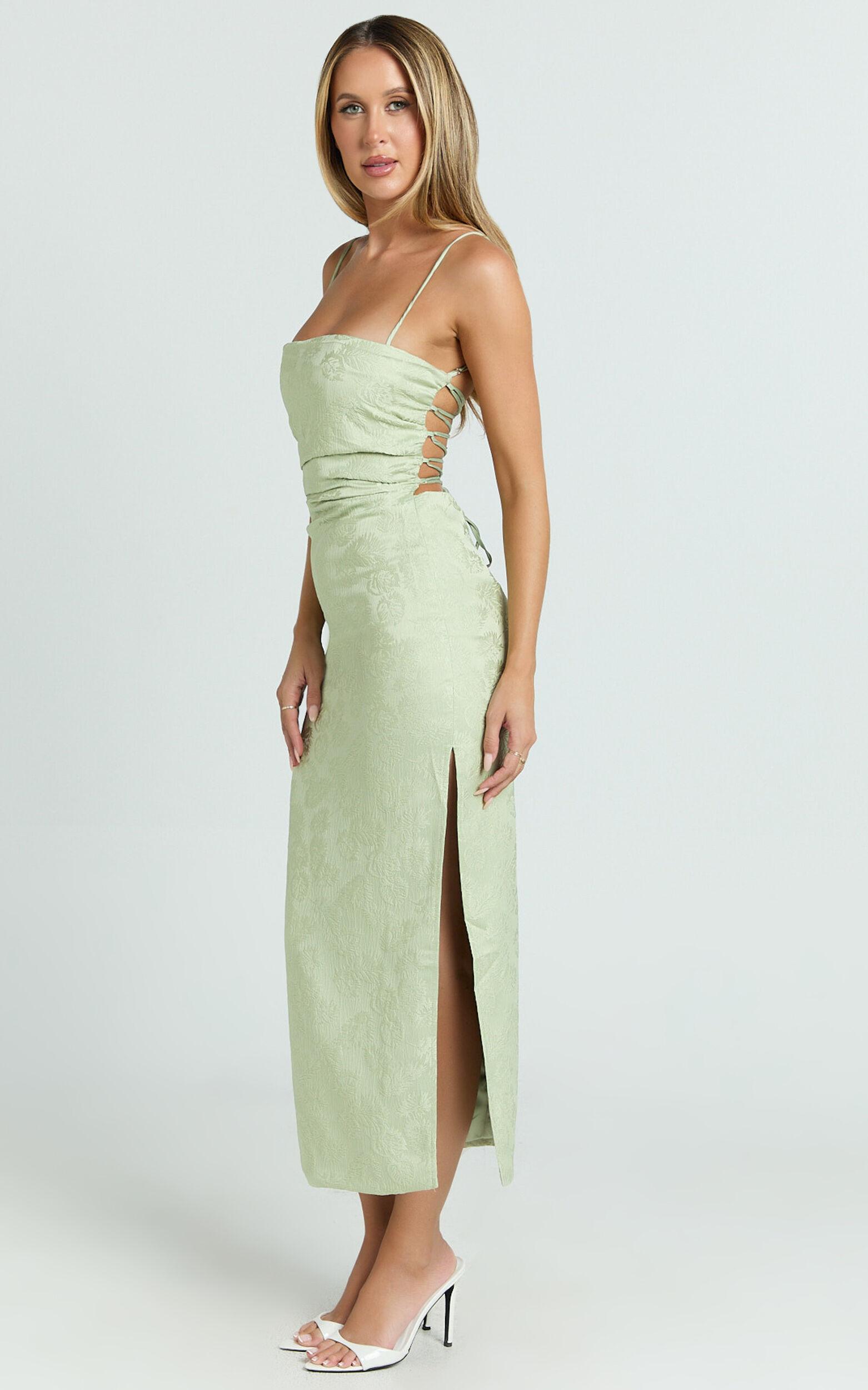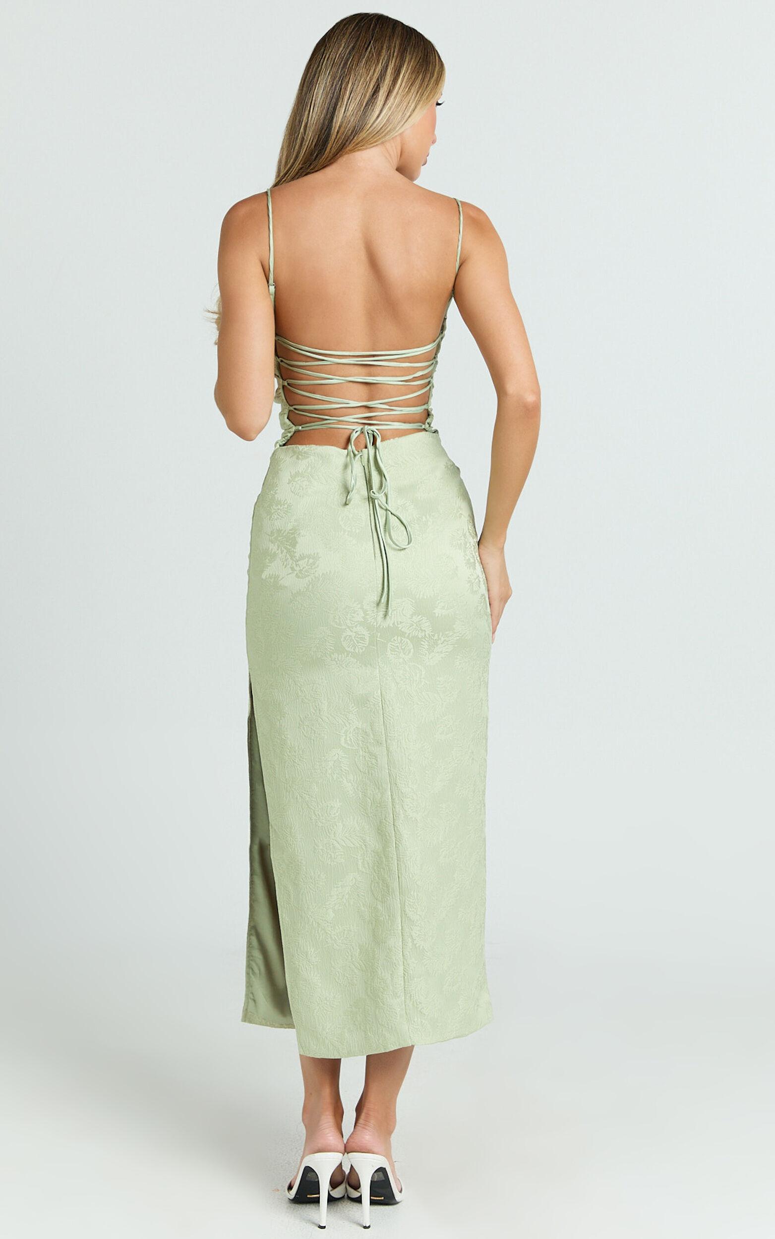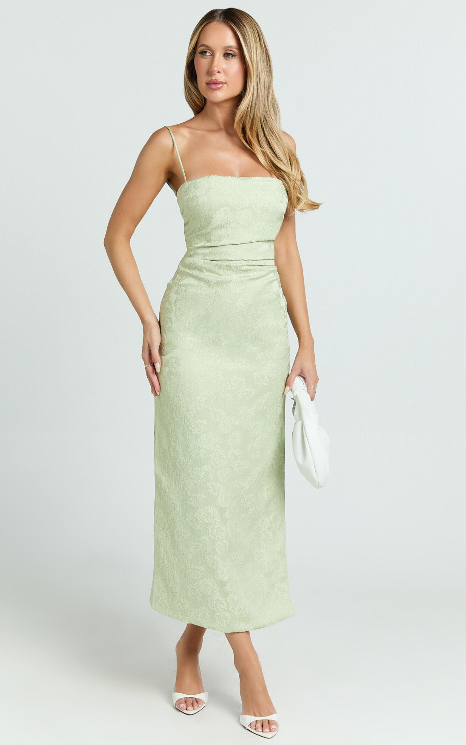 Elevate your style with our Indiana Midi Dress - a true embodiment of elegance and empowerment. This stunning Jacquard Square Neck Lace Back Fitted Dress comes in a mesmerizing shade of green, radiating charm and sophistication. Crafted for the modern woman, who values both style and comfort, this piece is a testament to the poise and power of femininity.Product Details:Fitted dressesZips featureInner liningClipped Jacquard fabricSquare necklineParty Day perfectMidi lengthSleeveless designPolyester materialSize and FitSize S / 8 length: 118cm / 46.46inMaterial and CareMain Fabric: 97% Polyester, 3% Spandex Lining: 96% Polyester, 4% SpandexLow Stretch