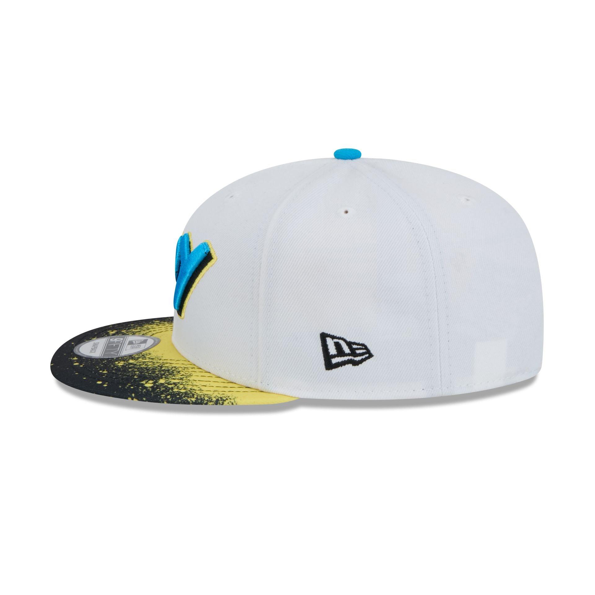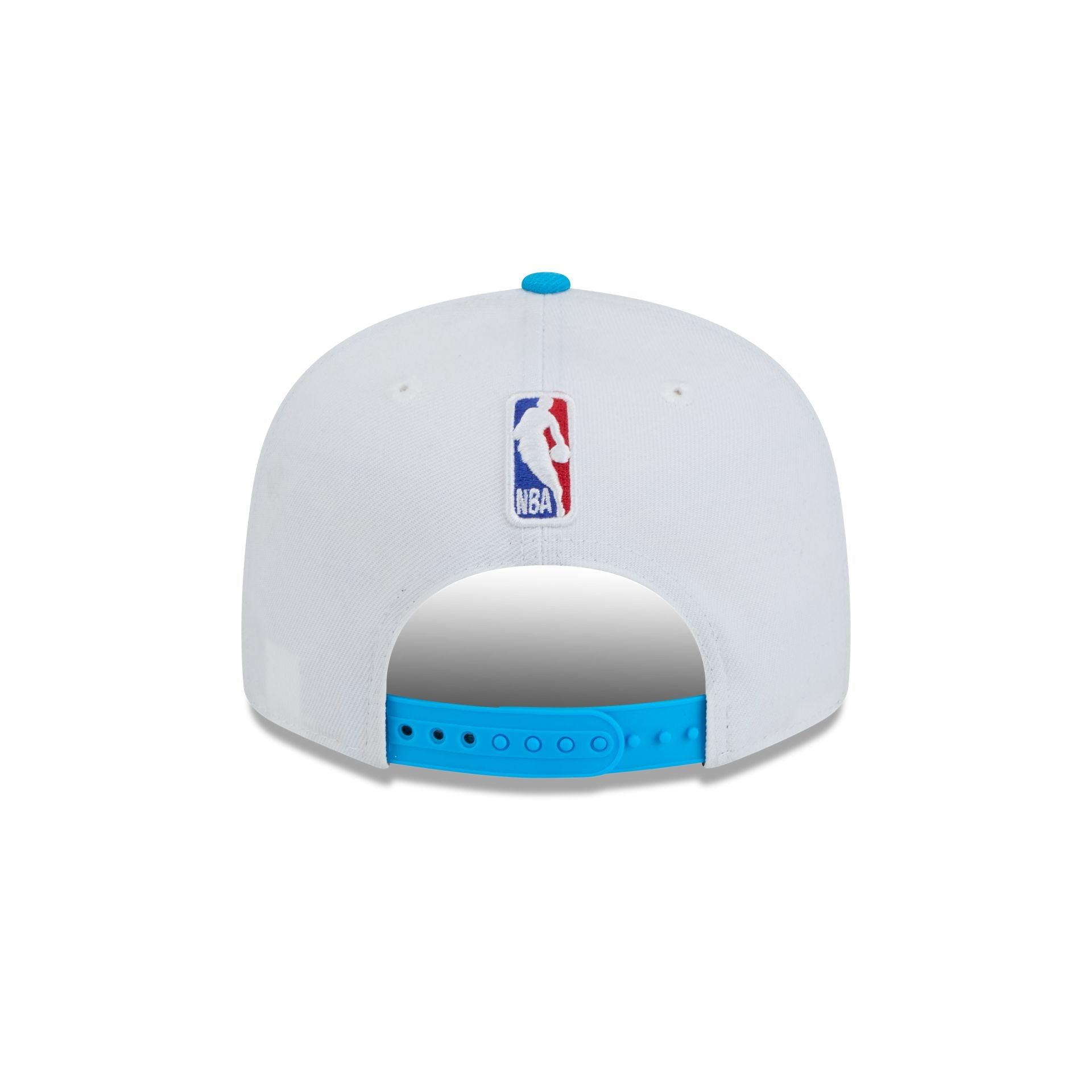 The Indiana Pacers 2024 City Edition 9FIFTY Snapback features an embroidered Pacers Indy wordmark at the front panels with an NBA Logoman above a snapback closure at the rear. Additional details include a team logo at the right-wear side and a gray undervisor.