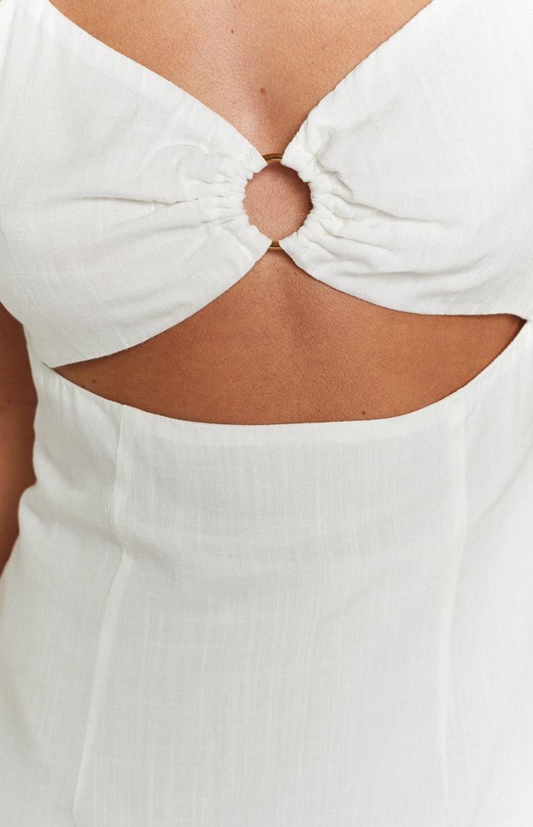 White Mini Dress How cute is this white mini dress! Perfect for vacation or a picnic with a special someone. Style with a blazer for a cool girl look on those chilly days and add gold jewellery for a finished look! Mini length Cut out design Lined Centre bust gold ring detailing Back zip closure Thin straps Lightweight material