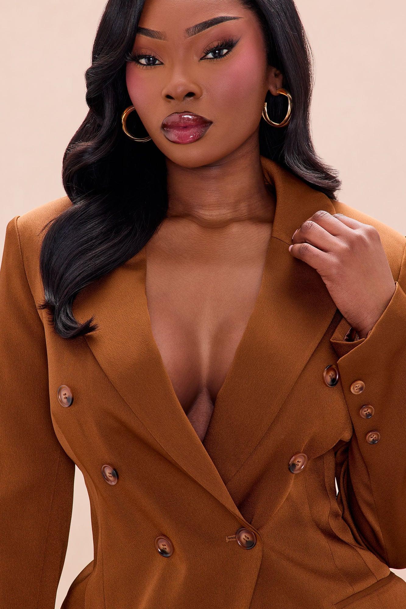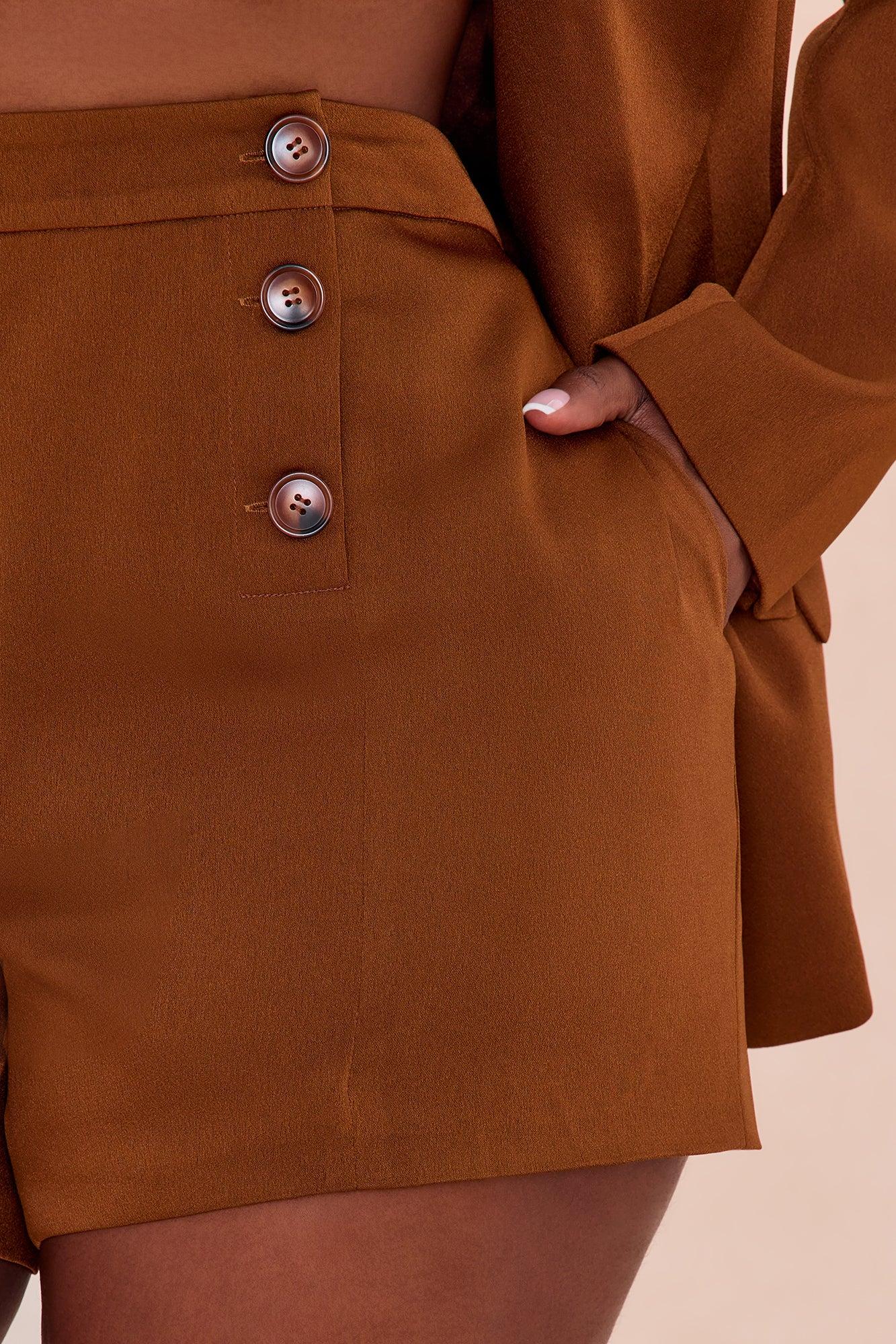Available In Chocolate. Short Ensemble Long Sleeve Blazer with Shoulder Pads Collared Pockets Double Breasted Front Button Closure Lined Non Stretch Short with Pockets Double Breasted Detail Faux Back Pockets Shell: 100% Polyester Lining: 95% Polyester 5% Spandex