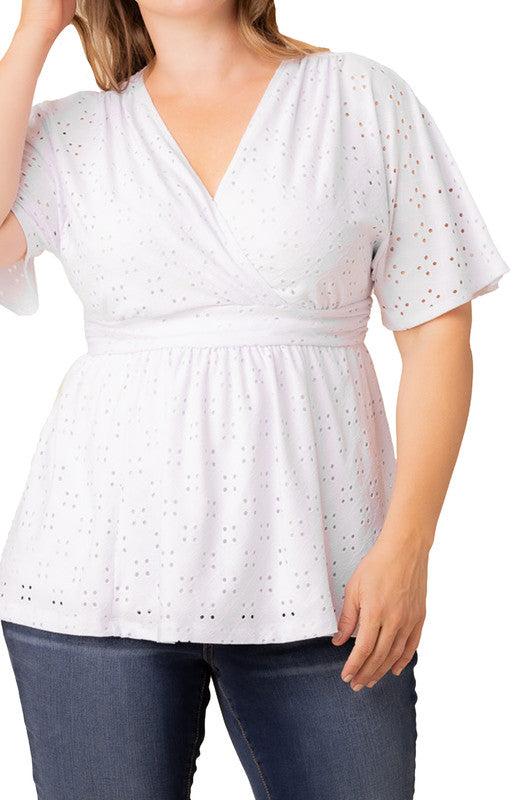 Embrace effortless elegance with the Plus Size Sunny Day Eyelet Top, a breezy blouse designed for warm-weather charm. Featuring a flattering surplice neckline and kimono-style sleeves, this top drapes beautifully over your curves. The shirred waistband enhances your shape, while the flowy peplum adds a playful touch.