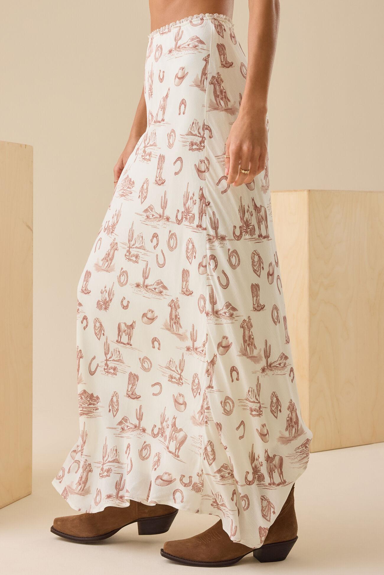 Capture the adventurous spirit of the frontier with our stunning Western print maxi skirt. This flowing skirt combines effortless comfort with a bold, distinctive style. It's the perfect piece to add a touch of rustic charm and unique character to your wardrobe!