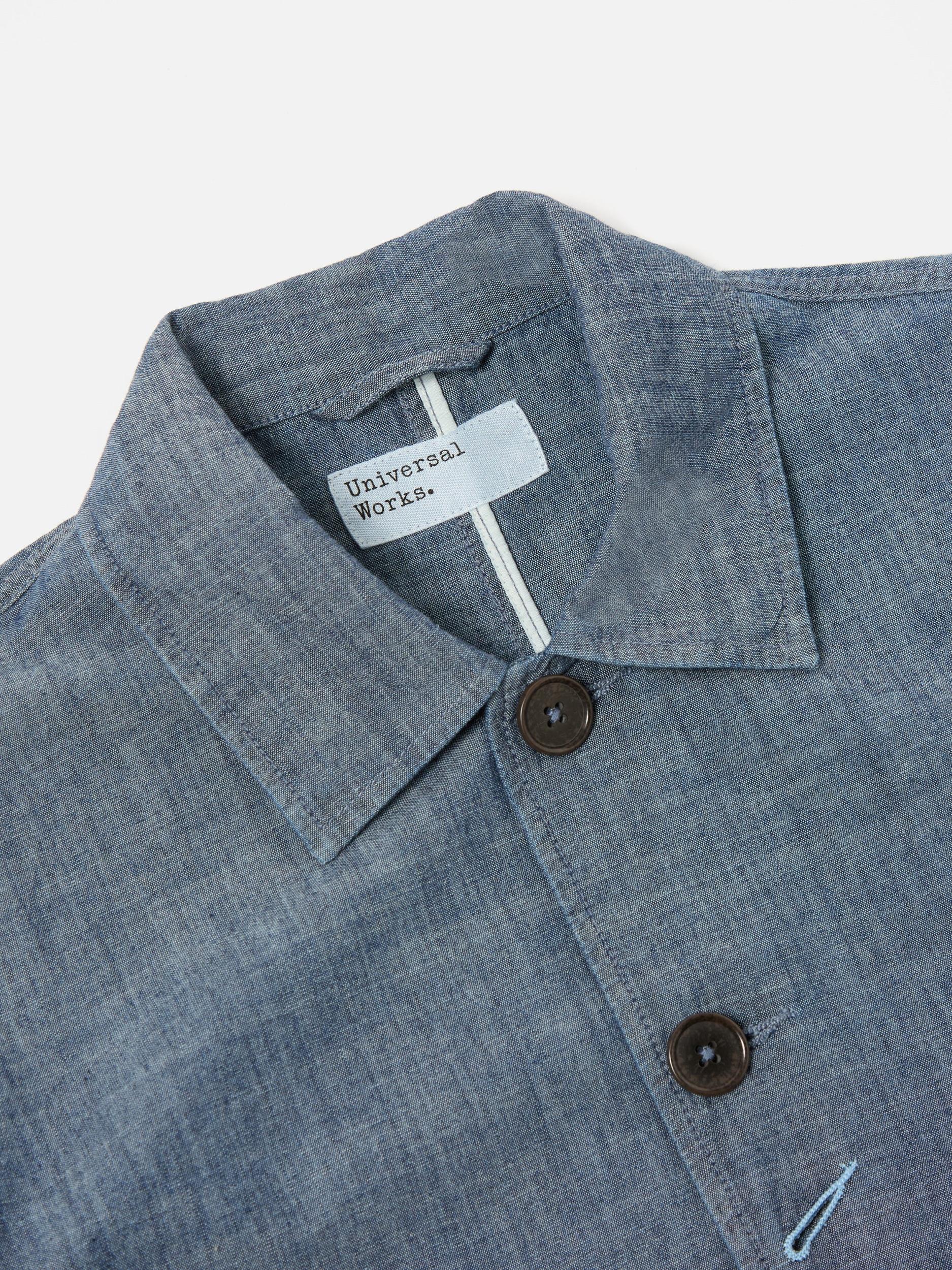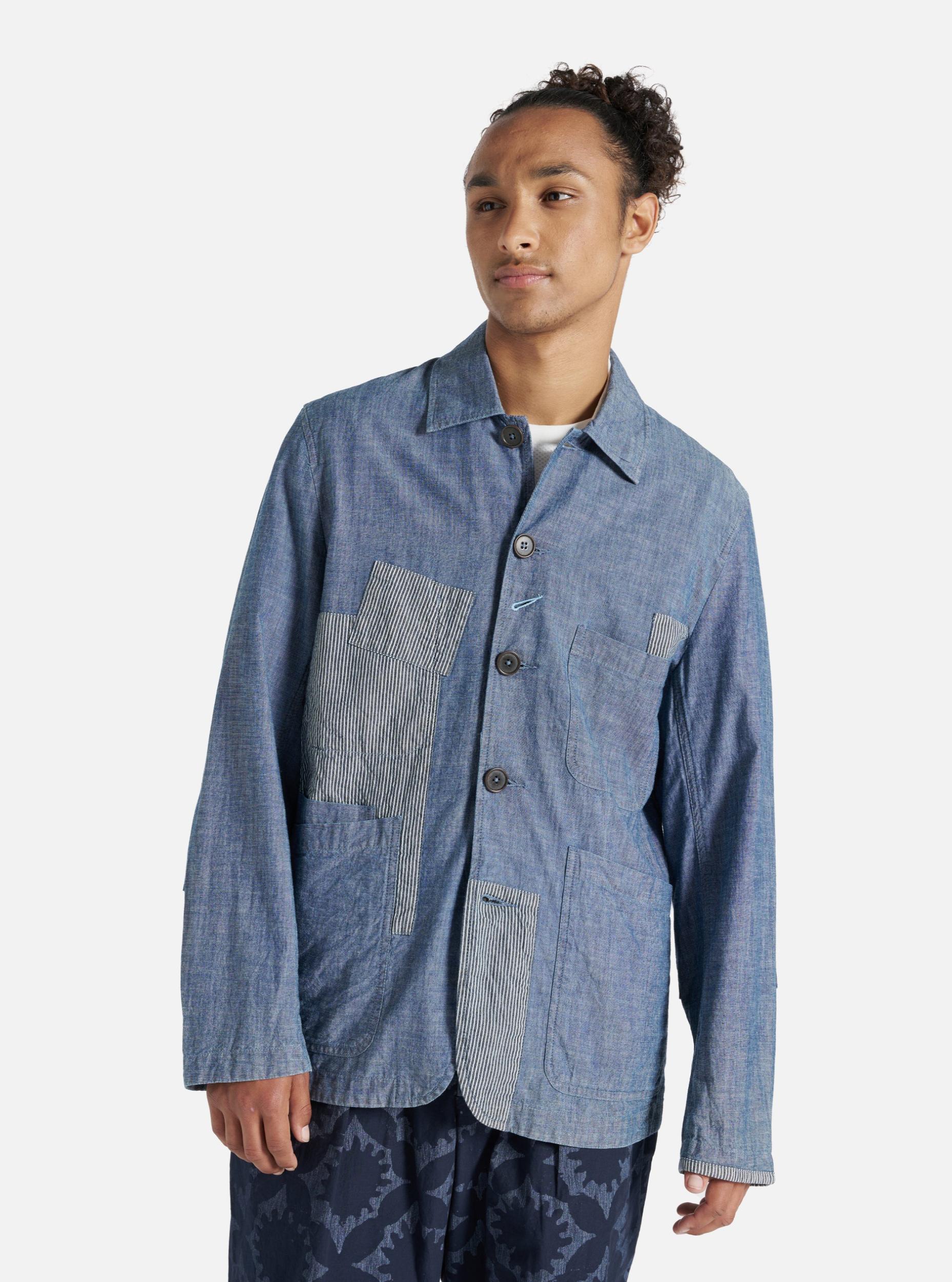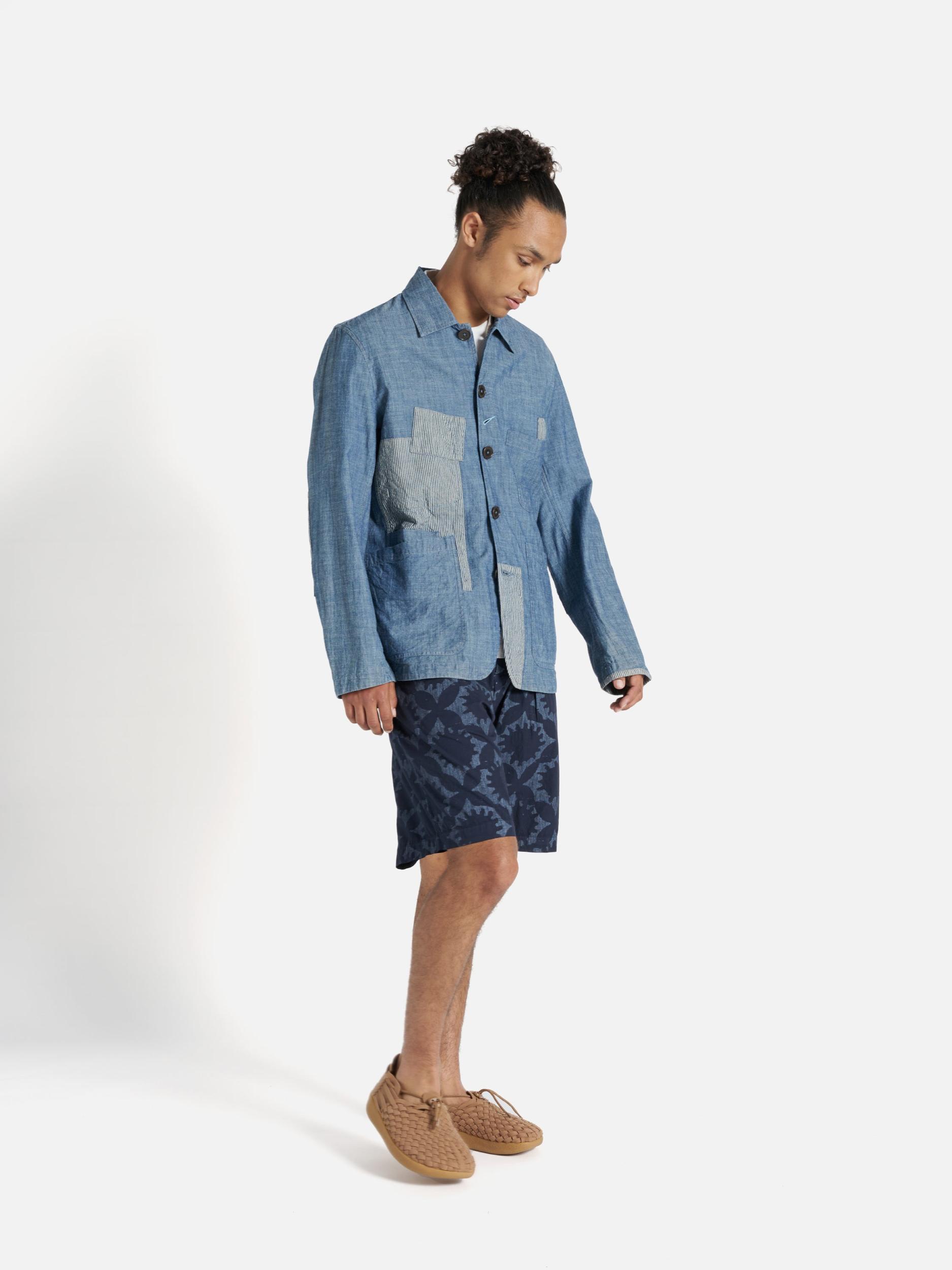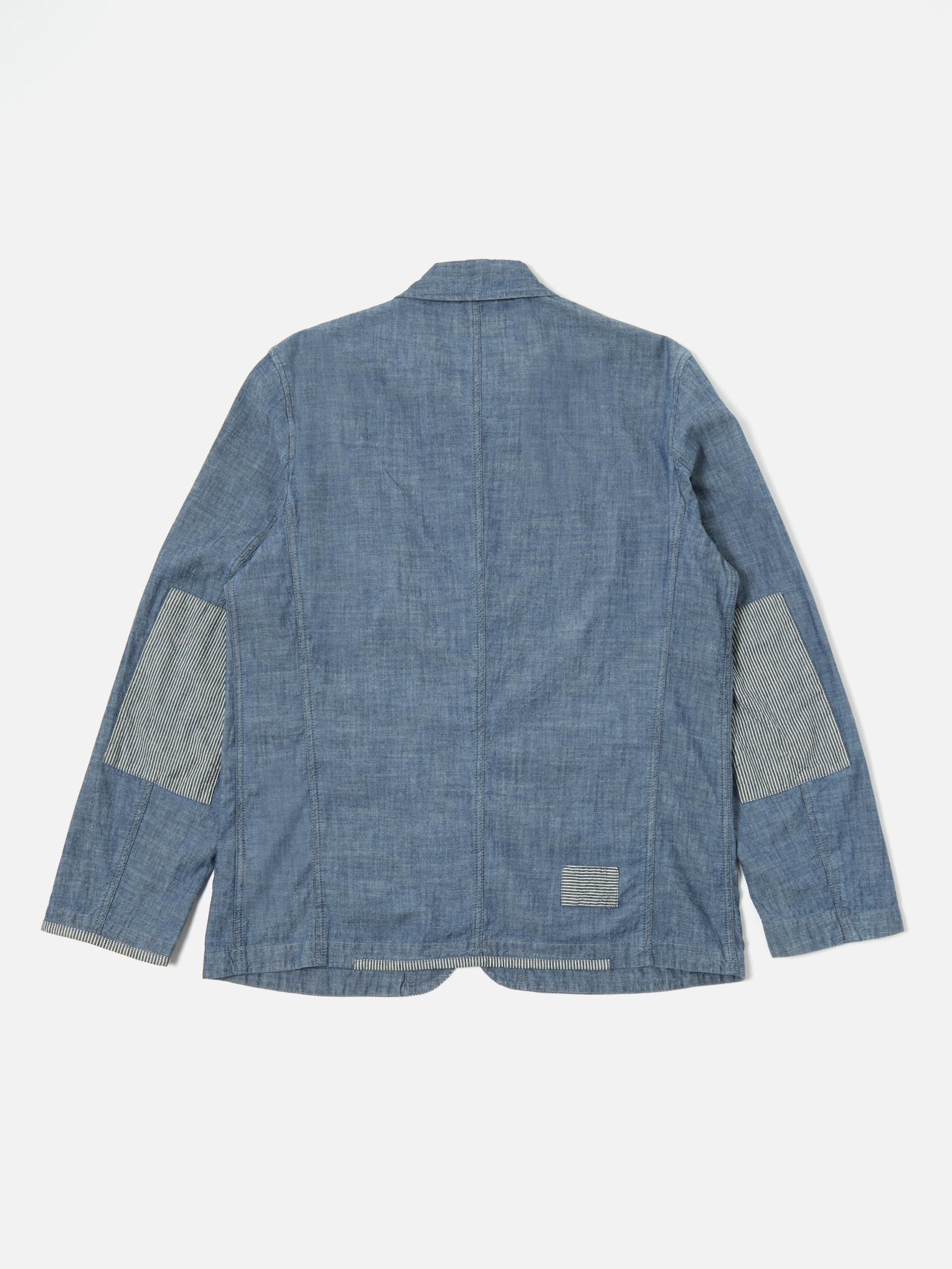 A patched version of our classic Bakers Jacket featuring contrasting trims and patches. It is no secret that here at Universal Works, we love Chambray! It has the perfect summer look and feel, and is available across a number of styles. Its fine weave and light weight make it an ideal choice for regulating heat and ensuring coolness during the warmer months. Due to the nature of the indigo dye, it will fade with time for that perfect ‘worn-in’ look, although it is susceptible to UV light so don’t fall asleep in the sun! This features added patches of 100% hickory stripe for a unique and stylish touch. • Product Code: P3008. • Looser fit than our classic 'Bakers' Jacket. • UW classic angled buttonhole. • Five-button front. • Two lower patch pockets. • Single partially concealed coin pocket. • One chest pocket. • One internal chest pocket & one internal hip pocket. • Fabric Content: 100% Cotton. • Washcare: Wash at 30 degrees. Do not bleach. Do not tumble dry. Cool iron. Do not dry clean. Wash like colours together. Do not iron decoration. [sizing] Our model is 6' 0'' with a 38' Chest and is wearing a size ‘Medium.’ Please be aware that the measurements below are technical measurements that are based on the garment laid flat and are useful as a general guide only. For advice on sizing, we have a small guide available here - or alternatively, contact us if you'd like any help. Measured in Centimetres. XS S M L XL XXL XXXL Centre Back Length. 69 71 73 75 77 79 81 Chest Width - 2.5cm Below Armhole. 53 55.5 58 60.5 63 65.5 68 Sleeve Length - From Shoulder (inc. Cuff.) 61.5 63 64.5 66 67.5 69 70.5 Across Shoulders. 44 46 48 50 52 54 56
