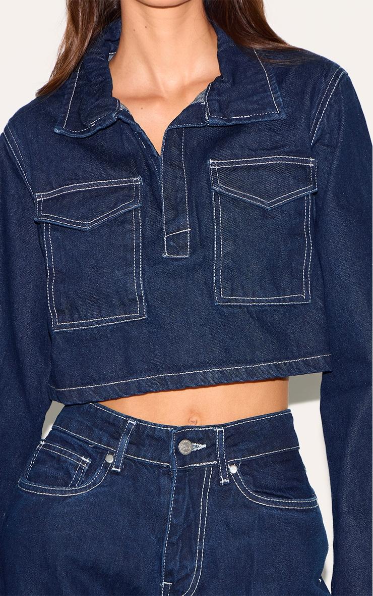 Embrace effortless chic with this indigo contrast stitch seam detail cropped denim shirt. Finished with utility pocket detailing, this shirt has a structural collar and a cute cropped fit. For the ultimate coordinated look, style this piece with the matching jeans, classic flat sandals and your go to shoulder bag. Length approx 38cm/15inch (Based on sample size US 4)Model wears size UK 8/ EU 36/ AUS 8/ US 4Model Height - 5ft 7inchp]:!mb-4inch>Brand: PrettyLittleThingCategory: DenimProduct type: Denim ShirtColor: IndigoMaterial: Rigid DenimSleeves: LongOccasion: Day
