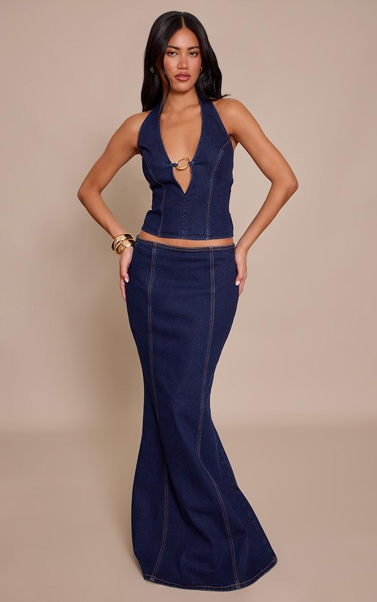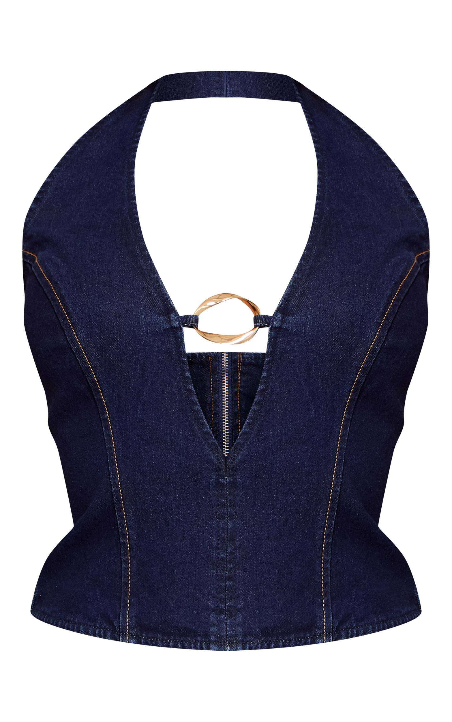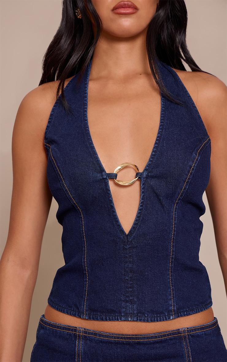 Dive into confident style with the indigo gold trim plunge detail denim top. This blue denim top features a contemporary halterneck and a deep plunge neckline, accented by a striking gold-tone trim. Perfect for sun-drenched day events that lead into chic evening plans. Team with matching denim pants, sophisticated gold heels, and some elegant gold earrings.Length approx 48.5cm/19inch (Based on sample size US 4)Model wears size UK 8/ EU 36/ AUS 8/ US 4Model Height - 5ft 6inchp]:!mb-4inch>Brand: PrettyLittleThingCategory: DenimProduct type: Denim TopColor: IndigoMaterial: Rigid DenimOccasion: Day