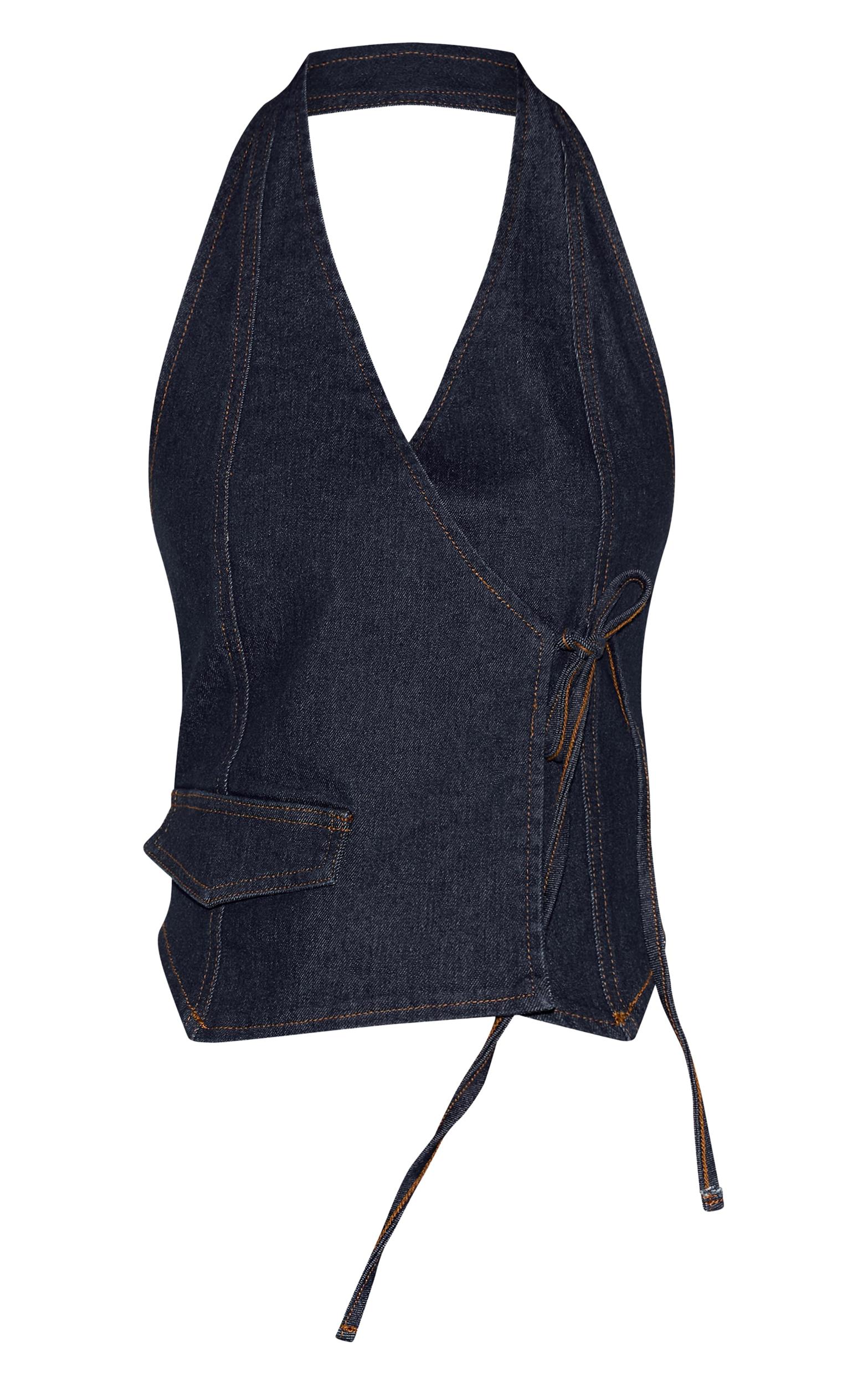 Brought to you in a classic indigo denim material with a flattering halterneck design and a chic wrap front detailing. Team this indigo halterneck wrap front denim vest with a pair of wide leg high waisted jeans and some statement hue court heels for a look we are loving right now.Length approx 38cm/15inch (Based on sample size US 4)Model wears size UK 8/ EU 36/ AUS 8/ US 4Model Height - 5ft 7inchp]:!mb-4inch>Brand: PrettyLittleThingCategory: DenimProduct type: Denim TopColor: IndigoMaterial: Rigid DenimOccasion: Day