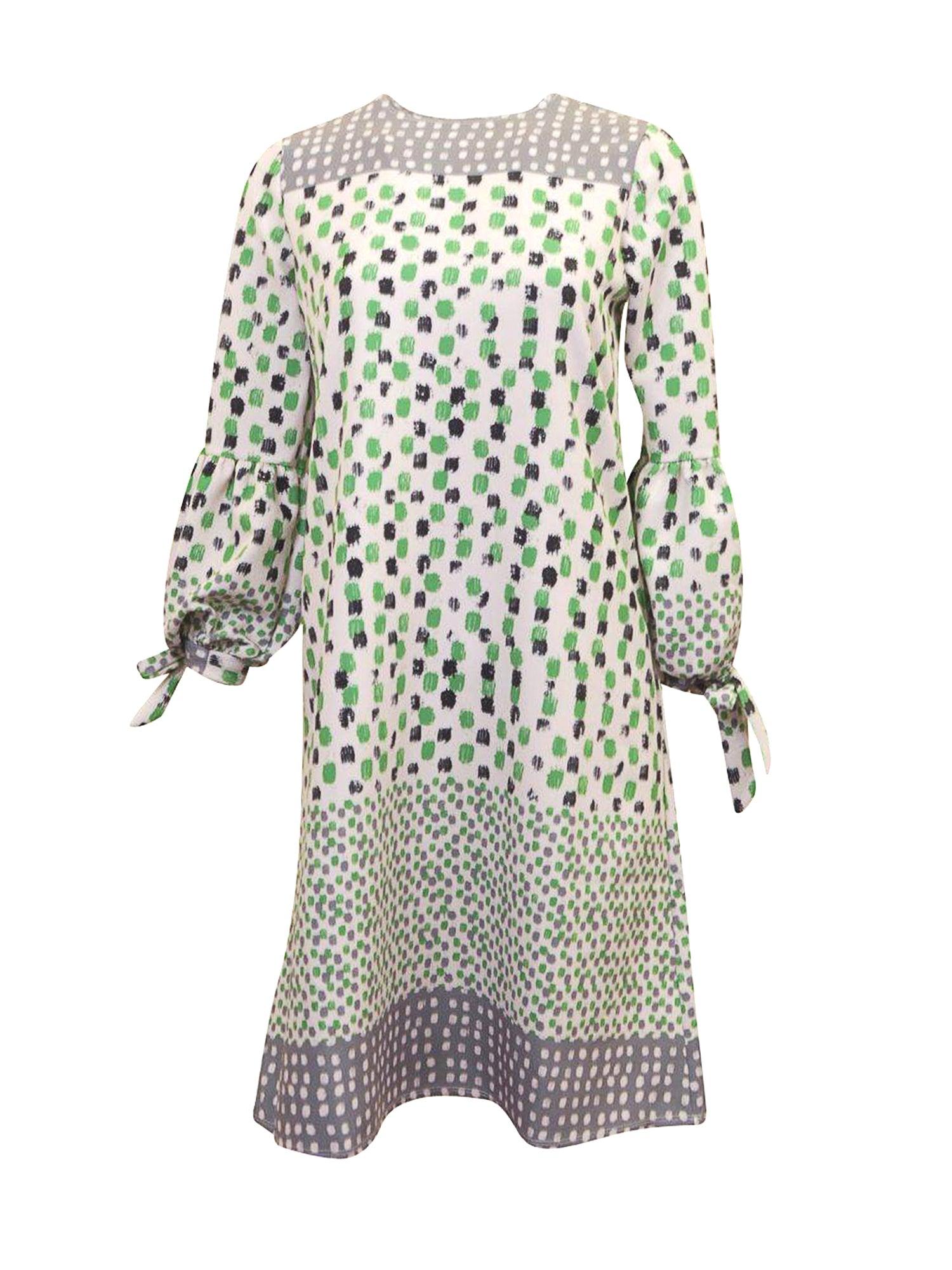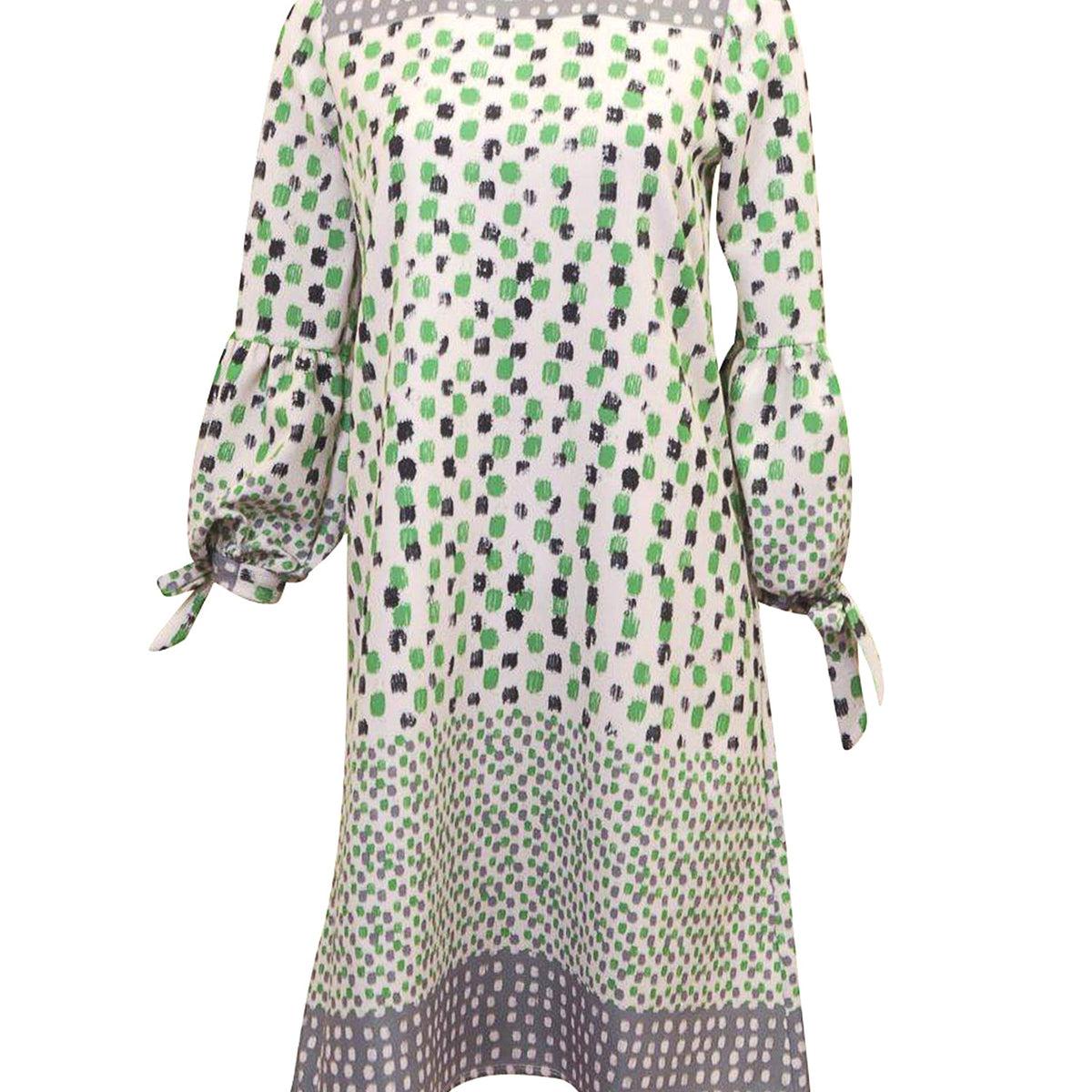 A-line dress with green black and grey square print. Poof sleeve. with tie.