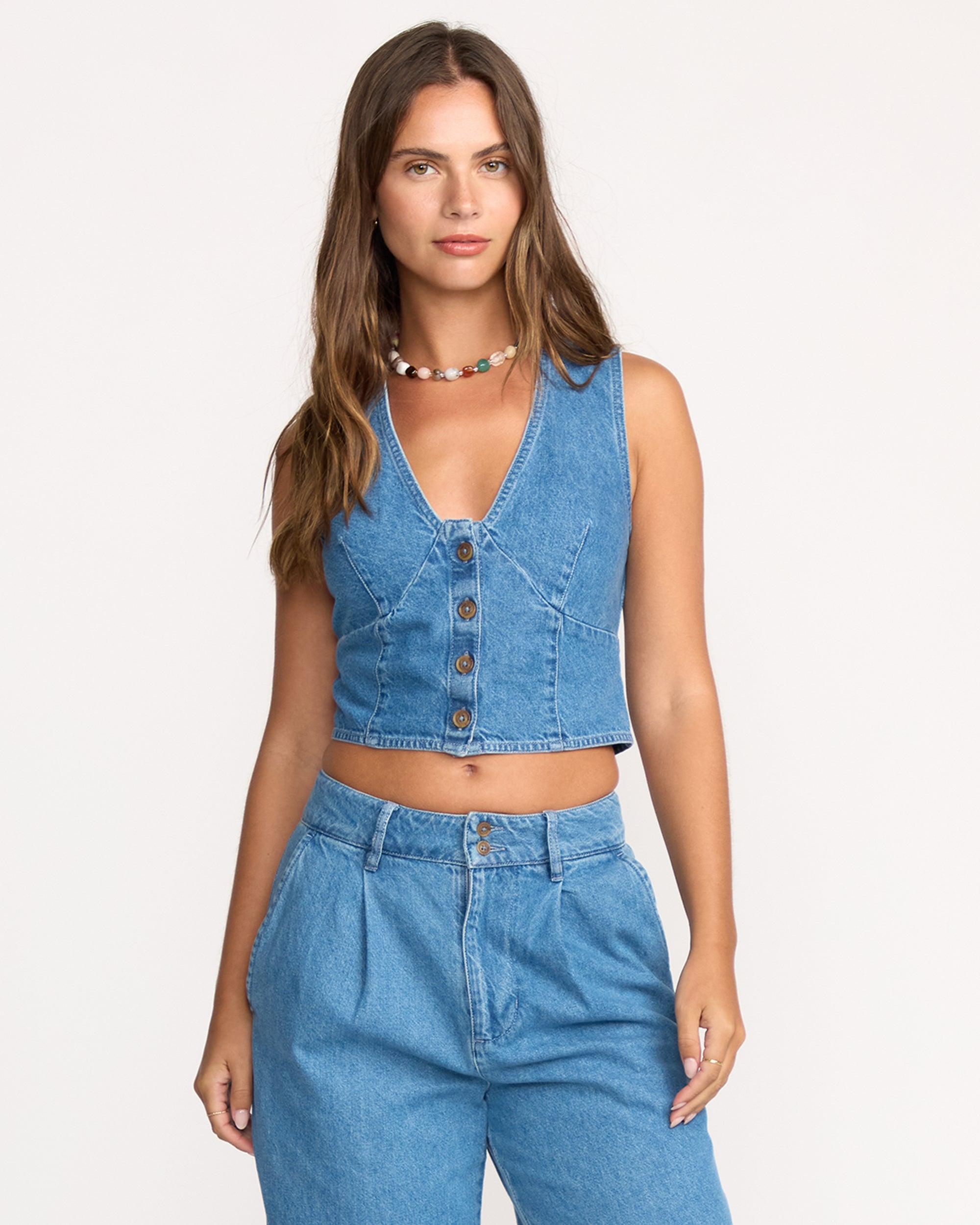 Our cotton denim crop top hugs in all the right places with its body-skimming fit. The v-neck and button-front closure add just the right amount of style to this versatile wardrobe essential. Featured here in the Blue colorway. Features 100% cotton, cotton denim Crop top Body skimming fit V-neck, button closure at front Woven sew down label