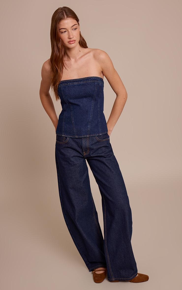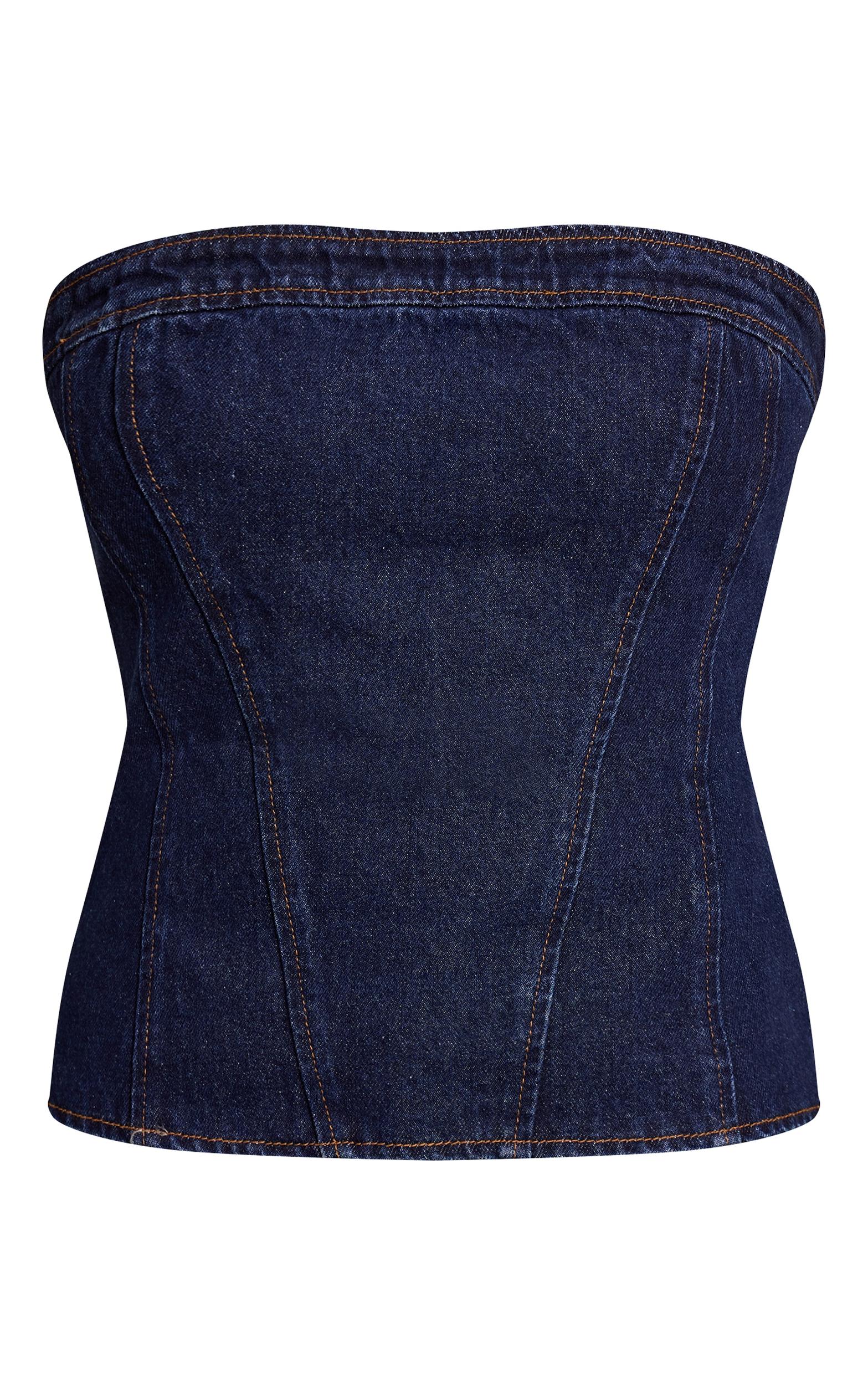 Consider the blueprint for elevated denim. The indigo strapless bustier detail denim corset top brings a confident edge to your daywear, showcasing a sharp strapless neckline and precise bustier seaming that sculpts an artful silhouette. Its deep indigo hue offers versatile styling possibilities. Pair this distinctive top with high-waisted tailored pants and knee high boots for an assured, contemporary ensemble. Finish the look with a minimalist black bag and subtle layered necklaces for a polished, knowing aesthetic that commands attention.Length approx 34.5cm/13.5inch (Based on sample size US 4)Model wears size UK 8/ EU 36/ AUS 8/ US 4Model Height - 5ft 9inchp]:!mb-4inch>Category: DenimProduct type: Denim CorsetColor: IndigoMaterial: Rigid DenimDesign: PrintNeckline: ShirtSleeves: LongOccasion: Evening