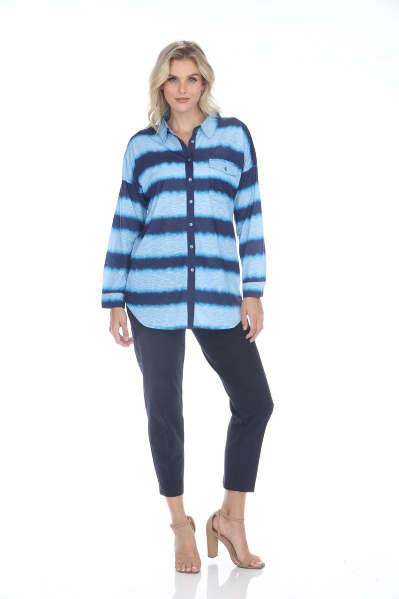 Tango Mango - classic and comfortable pieces in beautiful prints that are perfect for a laid-back lifestyle. This shirt features a button front to a collar, long drop shoulder sleeves, a relaxed A-line cut, a curved hem and front patch flap pocket. Made from a soft stretchy fabric in sky blue with an ombre indigo stripe. Style tip: fun to wear open as a layer