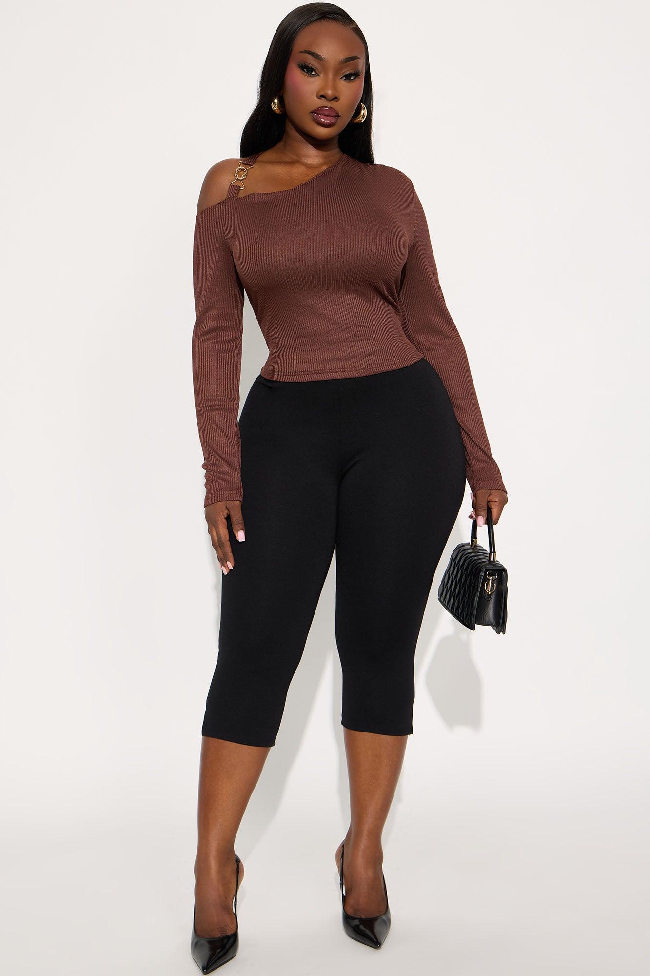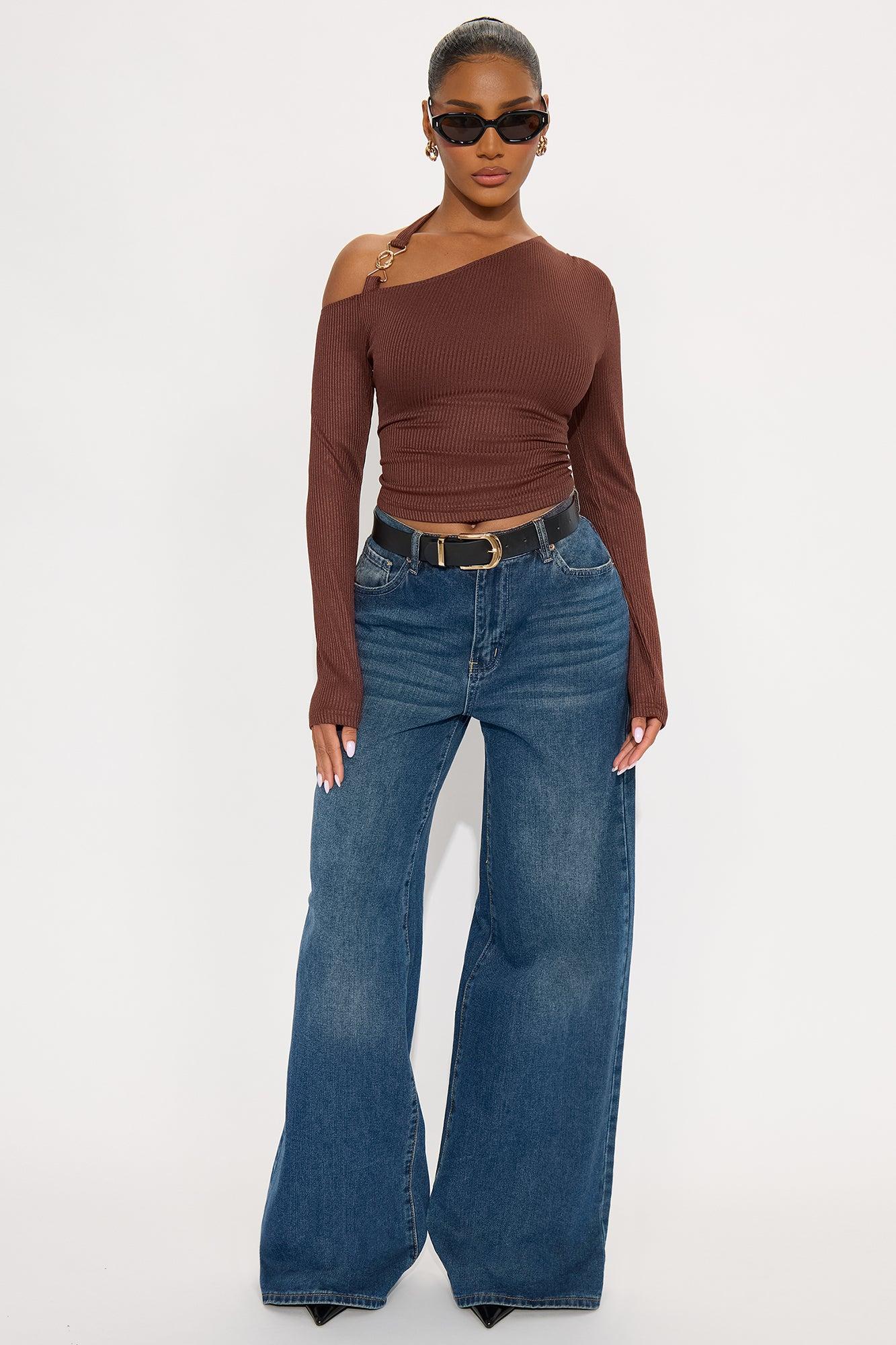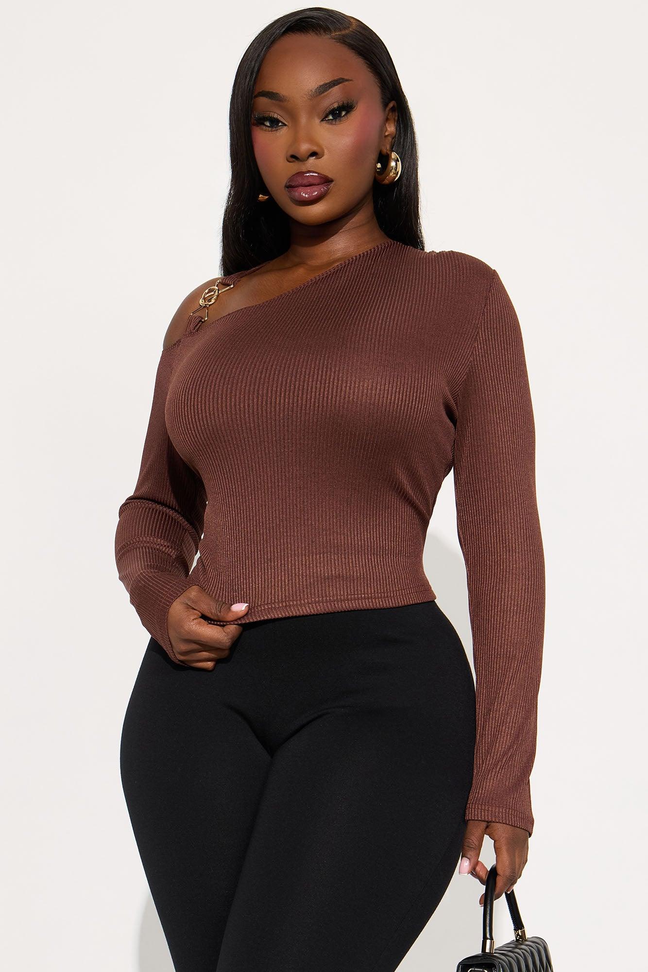 Individual Charm Ribbed Long Sleeve Top - Brown Female