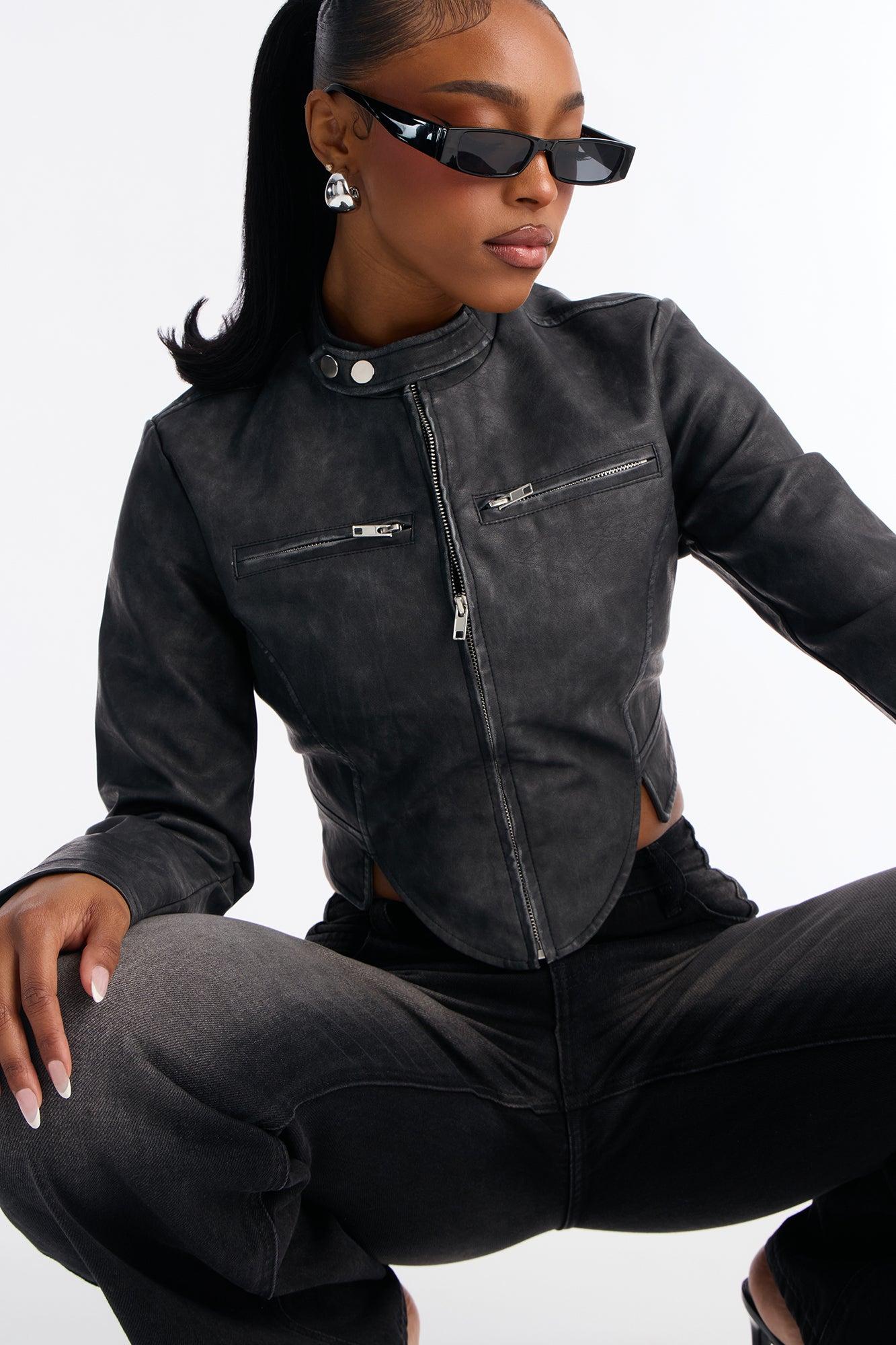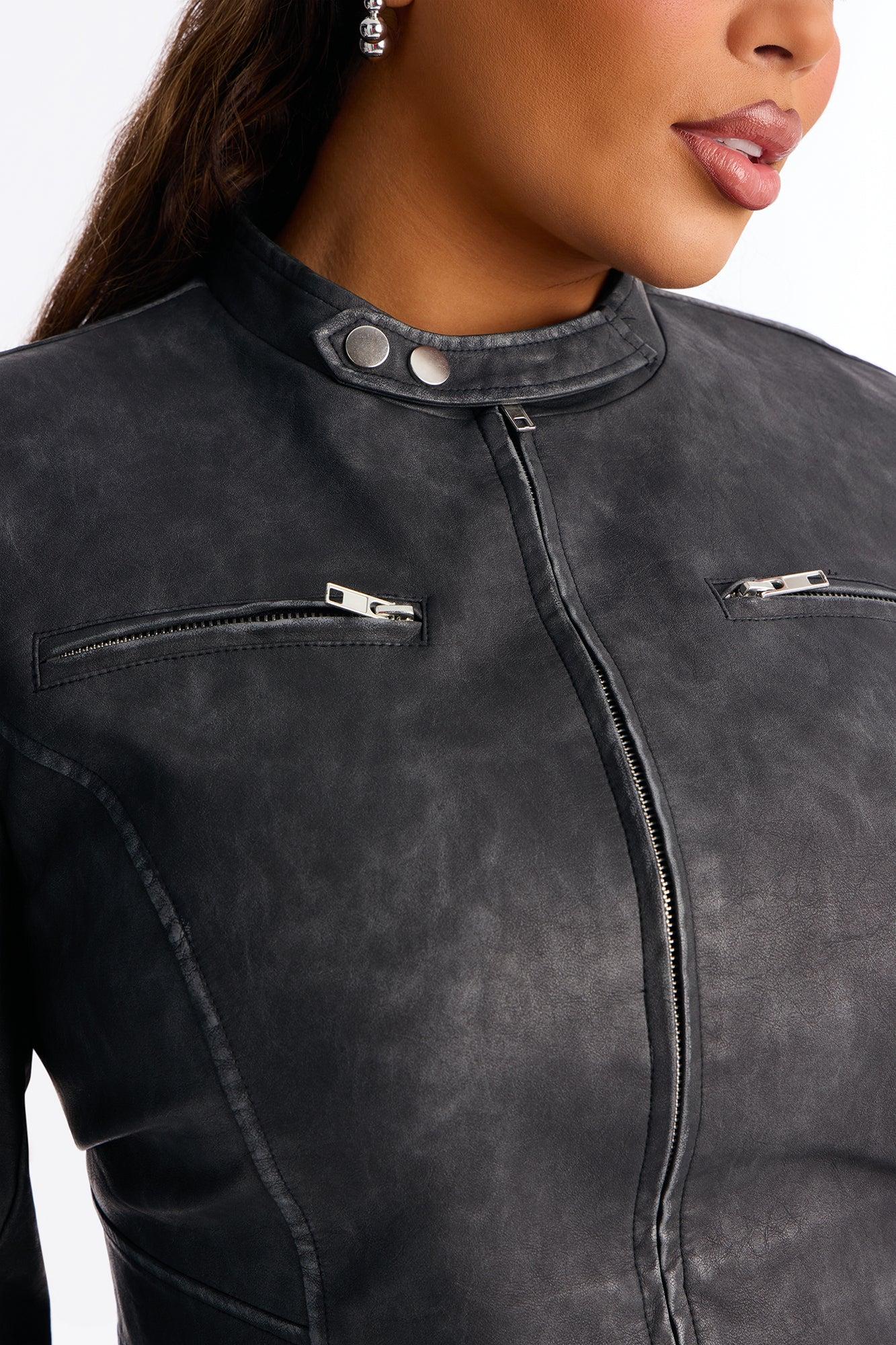 Available In Black, Olive And Taupe. Jacket Collar Long Sleeve Faux Leather Zipper Detail Asymmetrical Hem Fully Lined Self Coating: 100% Polyurethane Backup: 100% Viscose Lining: 100% Polyester Imported California Proposition 65WARNING: Cancer and Reproductive Harm - www.P65Warnings.ca.gov.
