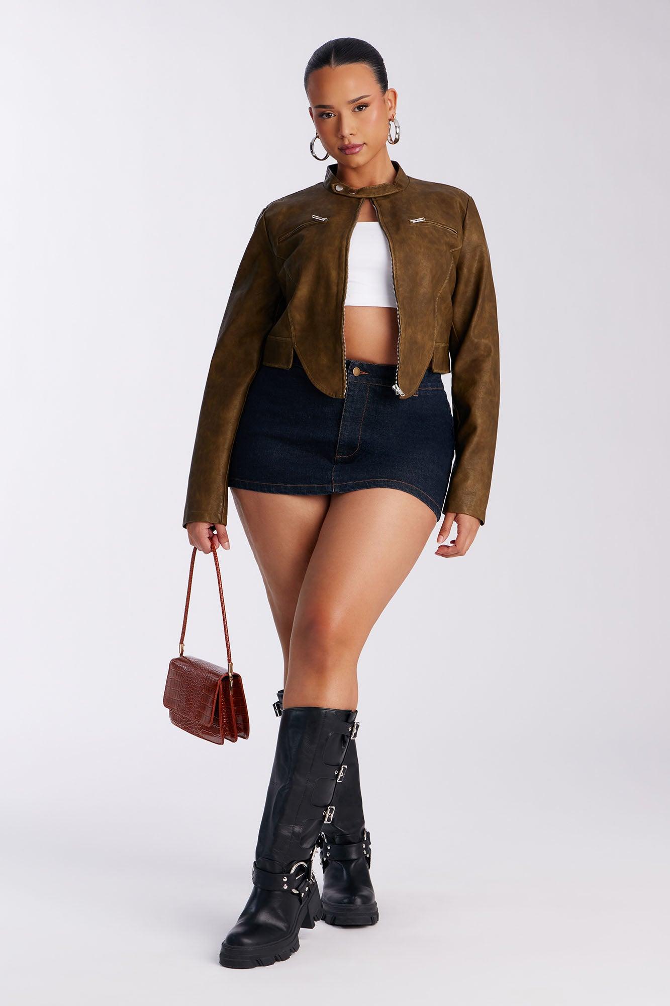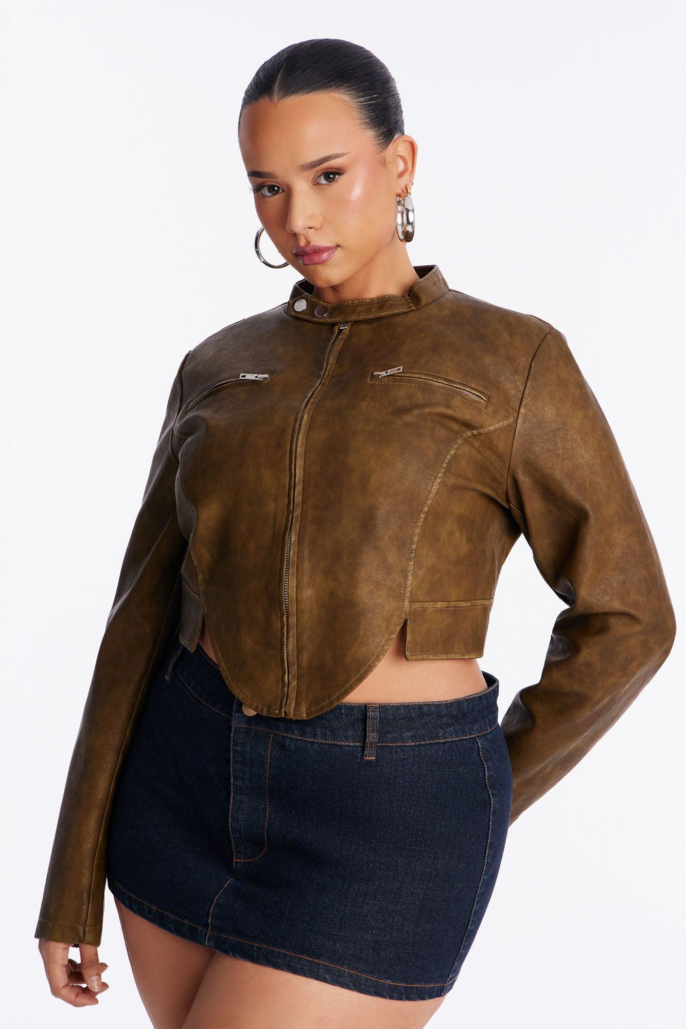 Available In Black, Olive And Taupe. Jacket Collar Long Sleeve Faux Leather Zipper Detail Asymmetrical Hem Fully Lined Self Coating: 100% Polyurethane Backup: 100% Viscose Lining: 100% Polyester Imported California Proposition 65WARNING: Cancer and Reproductive Harm - www.P65Warnings.ca.gov.