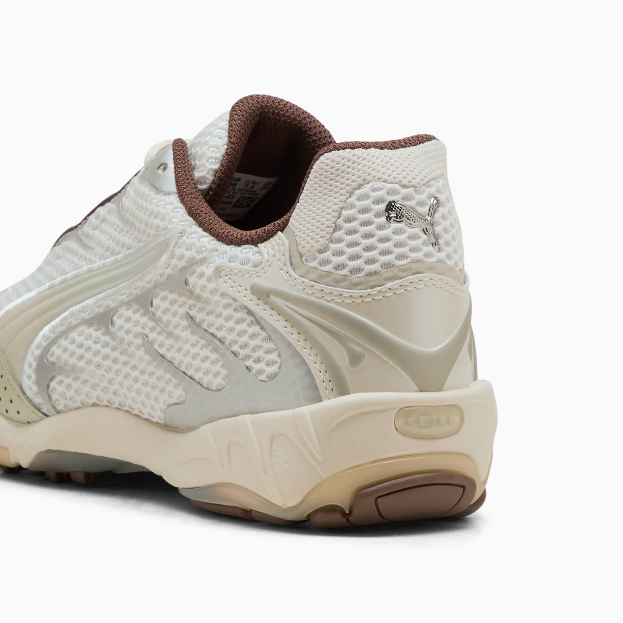 In the 2000s, performance shoes sought new ways to maximize energy. In running, that meant new takes on material play and thick soles, including the PUMA Inhale. It featured exaggerated contours and curves on its upper, inspired by the proper breathing needed to excel at and maximize performance. The newest member to the inhale family features a textile and synthetic leather base and embossed metallic detailing. Regular fitLace closureSynthetic leather overlaysRubber soleRounded toe | PUMA Inhale Metallic Women's Sneakers in White, Size 6.5
