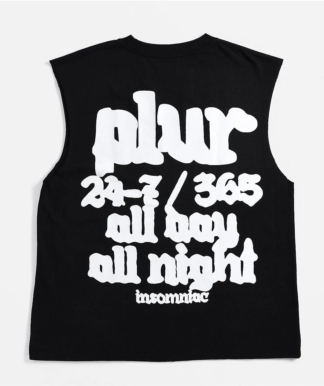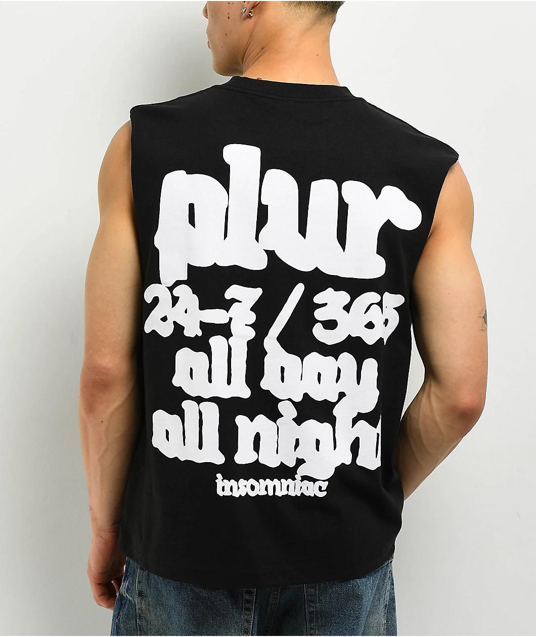Influenced by rave culture and EDM, Insomniac welcomes the PLUR tank top in a Stone black cotton construction with bold, eye-catching text printed on the front and back. Lending a DIY cut-off look with unfinished arm openings, the breathable sleevele