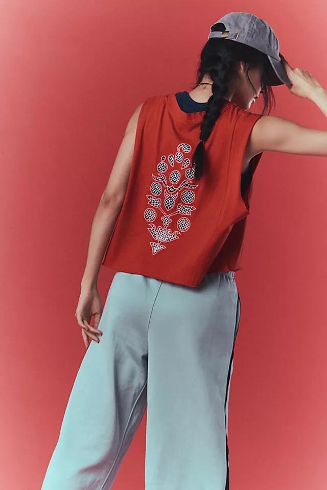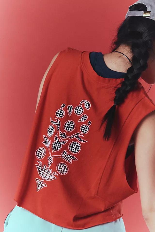 **Features:** Soft, smooth fabrication; muscle-tee silhouette is boxy, slightly oversized; scoop neck; crocheted Buti detail