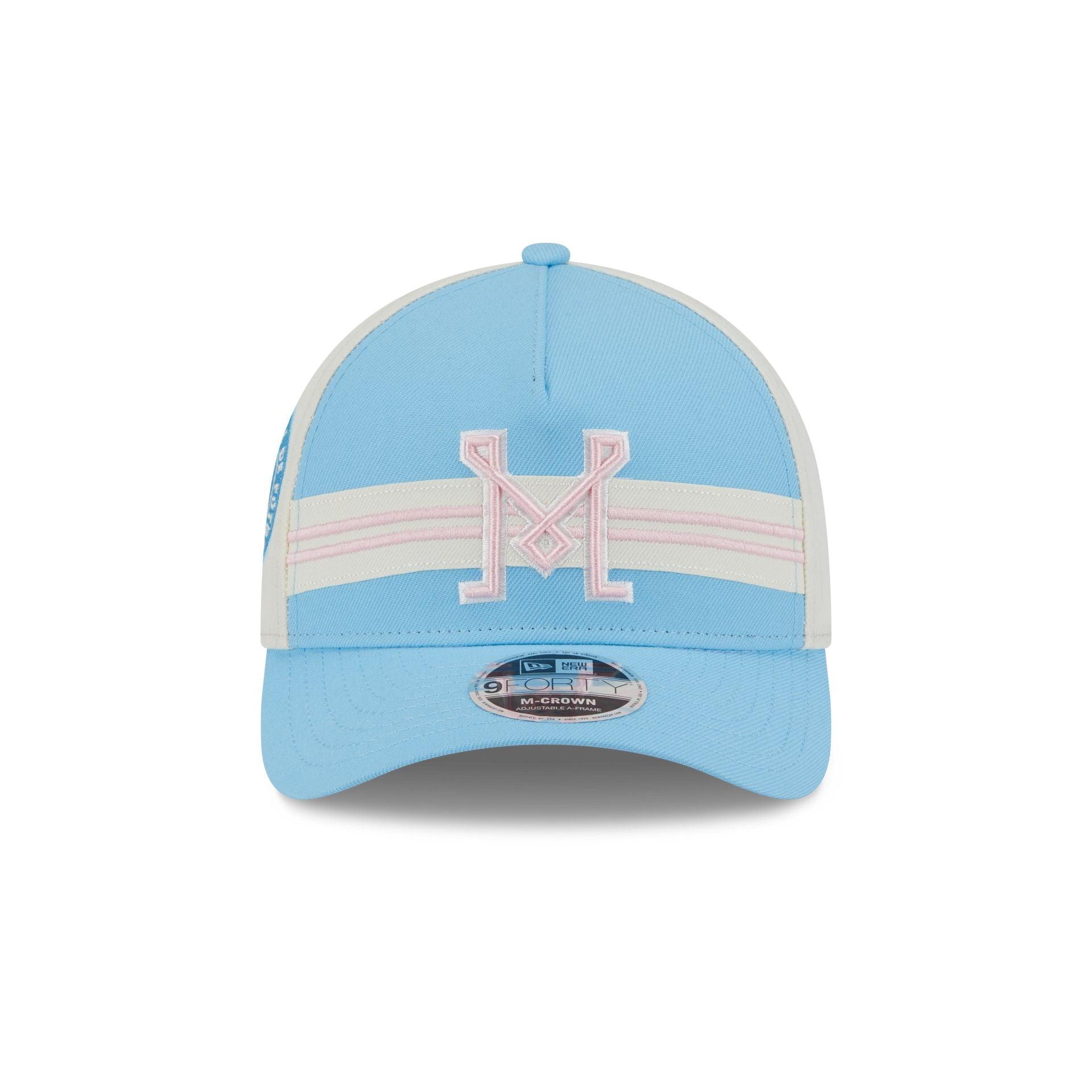 The Inter Miami 2025 Jersey Hook Light Blue 9FORTY M-Crown A-Frame Snapback features an embroidered Inter Miami logo at the front panels with a team circle patch at the right-wear side. Additional details include a snapback closure at the rear and a pink undervisor.