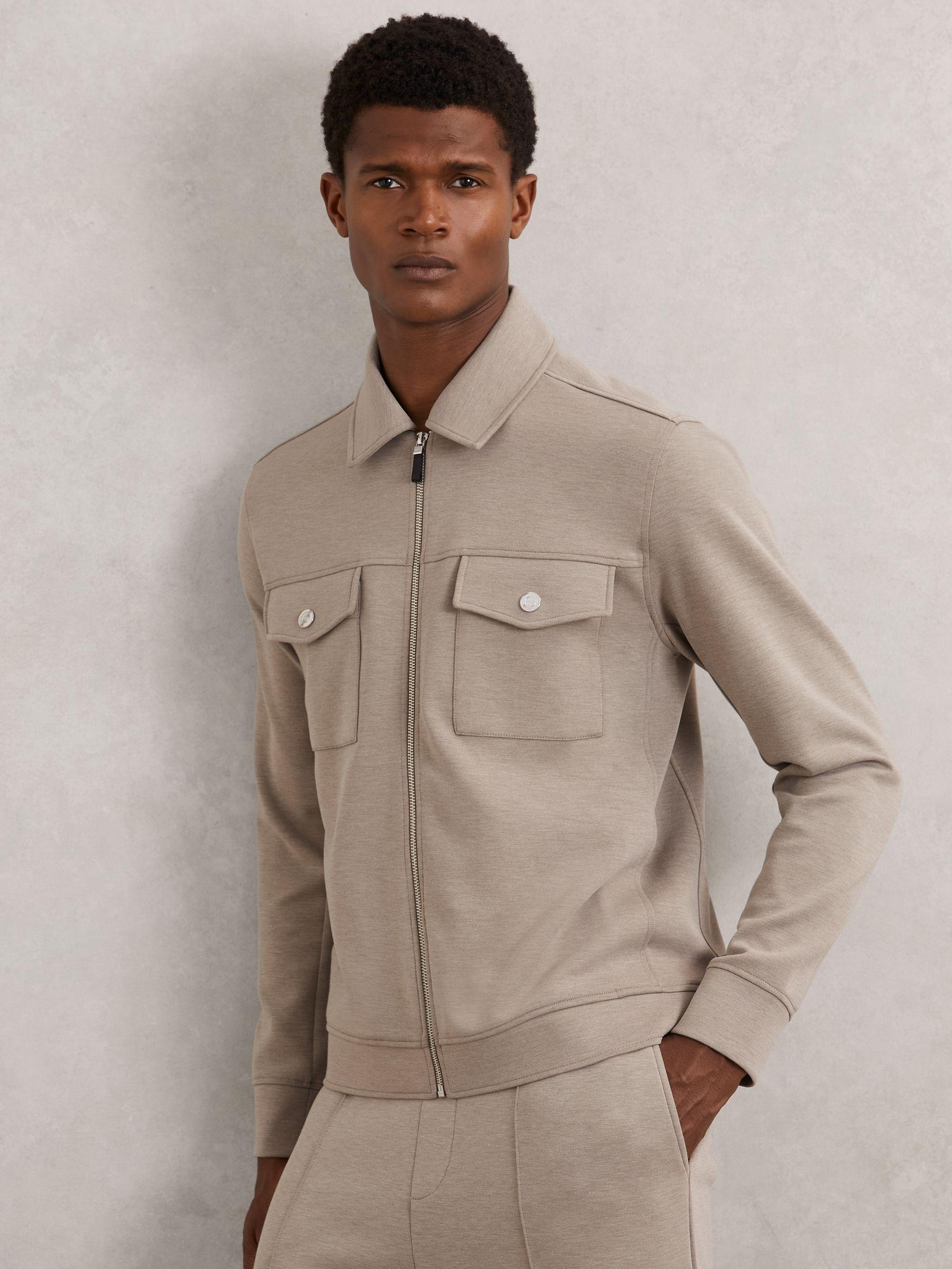 Interlock Jersey Zip-Through Jacket in Taupe Brown