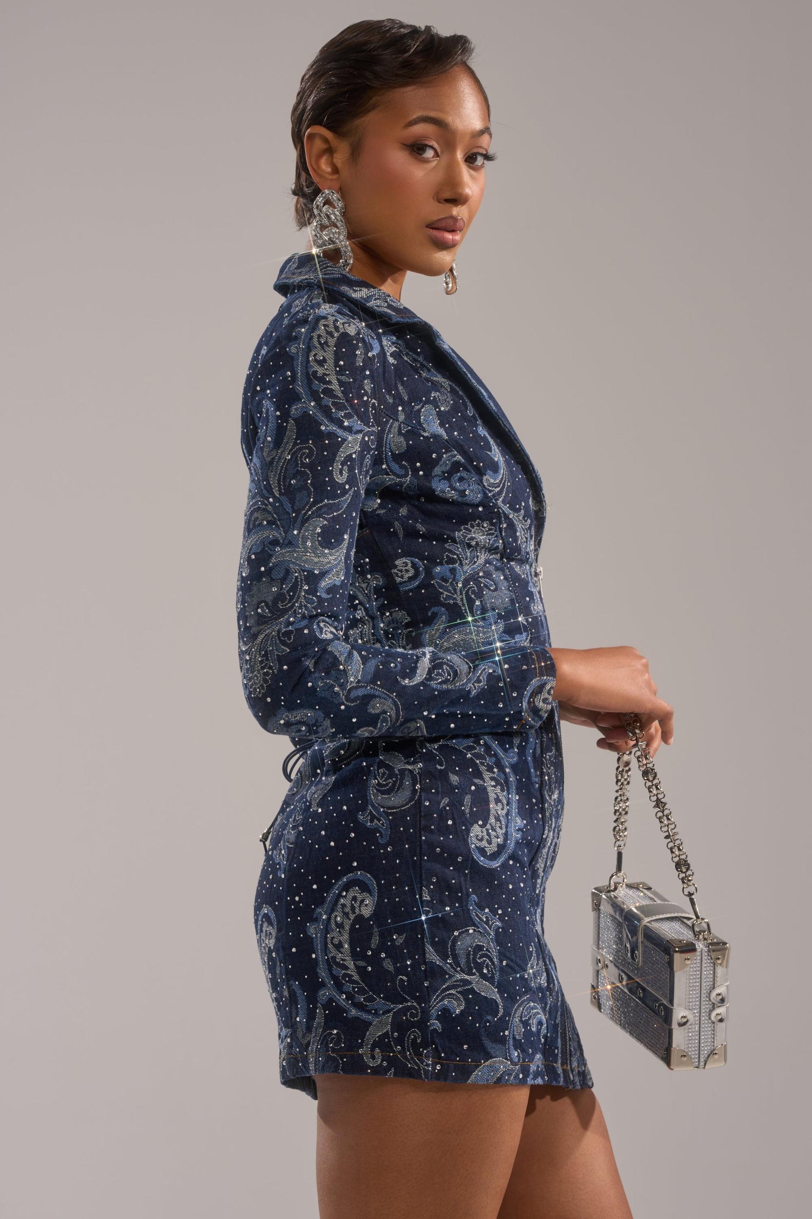 The AKIRA Label Into Something Better Denim Blazer Mini Dress combines classic tailoring with a touch of sparkle. Crafted from dark denim with an intricate paisley print and rhinestone embellishments, this piece brings texture and shine to a structured silhouette. The collared neckline, notch lapel, and long sleeves lend a polished edge, while the front zip closure adds a modern, versatile finish. - 95% Cotton, 5% Spandex- No Stretch- Imported (all measurements approximate from size small)- 32” Shoulder to Hem- 13” Shoulder to Shoulder- 24” SleevesProduct ID: 1072222 (all measurements approximate from size 1X)- 35” Shoulder to Hem- 16” Shoulder to Shoulder- 26” SleevesProduct ID: 1072226