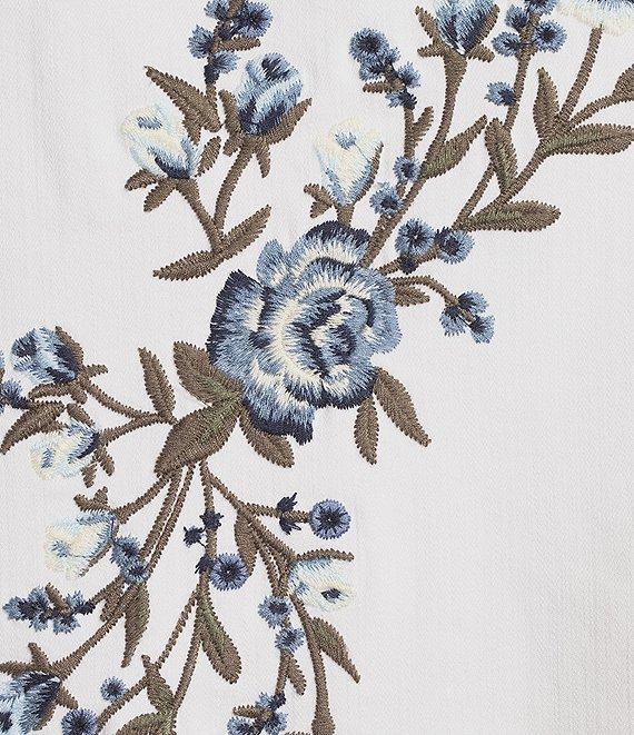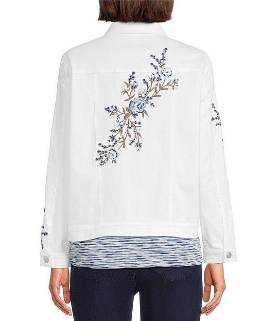 From Intro, this jacket features: Stretch denim fabrication Point collar Long sleeves with buttoned cuffs Placed embroidery detail Functional front flap pockets and side pockets Straight hem Button-front closure Approx. 22.75" length Cotton/rayon/polyester/spandex Machine wash Imported.
