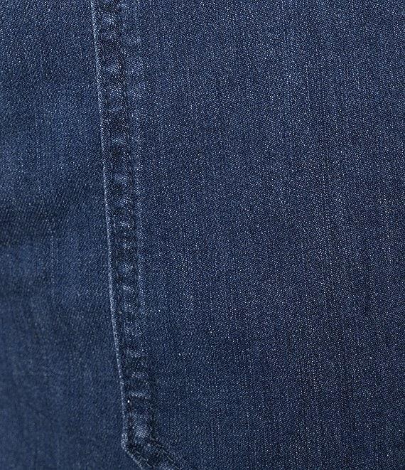 From Intro, these pants feature: Freedom denim fabrication Relaxed leg Belt loops Front pork chop pocket, back patch pockets Cropped length Straight hem Button/zip closure Approx. 27" inseam Cotton/rayon/polyester/spandex Machine wash/tumble dry Imported.