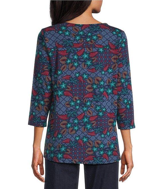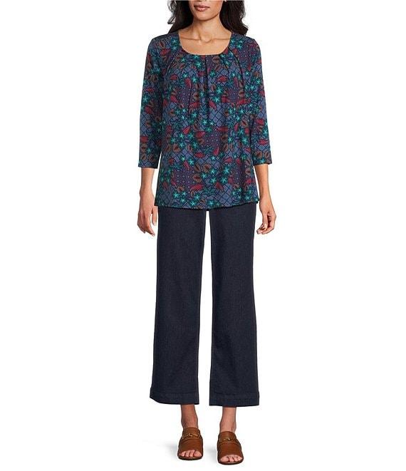 From Intro, this tee features: Knit jersey fabrication Pleated neckline 3/4 sleeves Straight hem Pullover construction Approx. 26.25" length Rayon/spandex Machine wash/dry flat Imported.