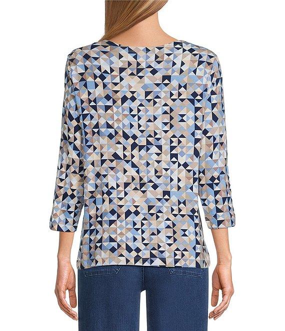 Intro Petite Size Knit Jersey Ink Geometric Print Boat Neck 3/4 Sleeve Tee