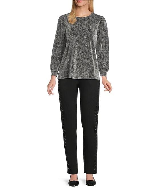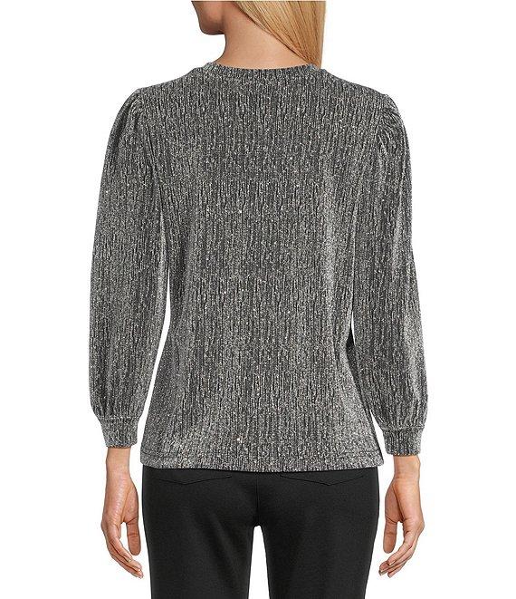 From Intro Petite, this top features: Lurex knit fabrication Crew neckline Bracelet length poet sleeves Straight hem Pullover construction Approx. 22.5" length from center back Polyester/metallic/spandex Machine wash/dry flat Imported.