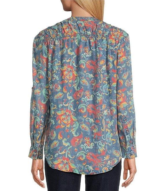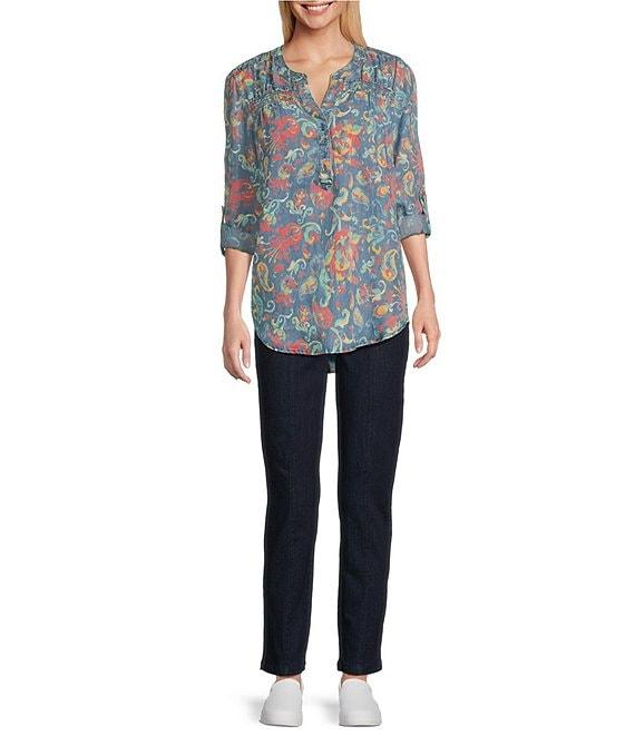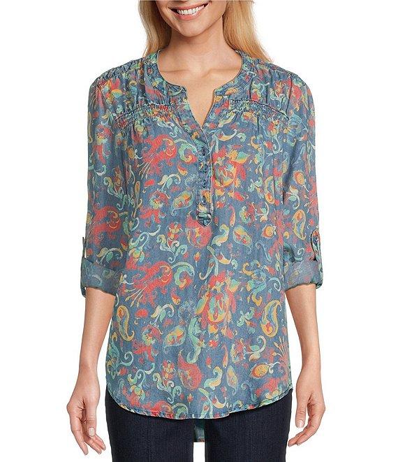 From Intro, this blouse features: Y-neck with half placket collar Long roll-tab sleeves Shirred yoke at front and back body Shirttail hem hemline Pullover construction Front half placket Approx. 31.75" length Lyocell Machine wash/line dry Imported.