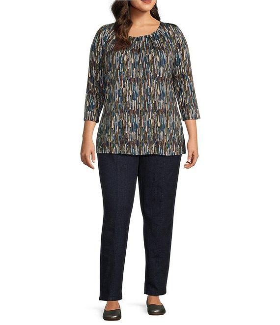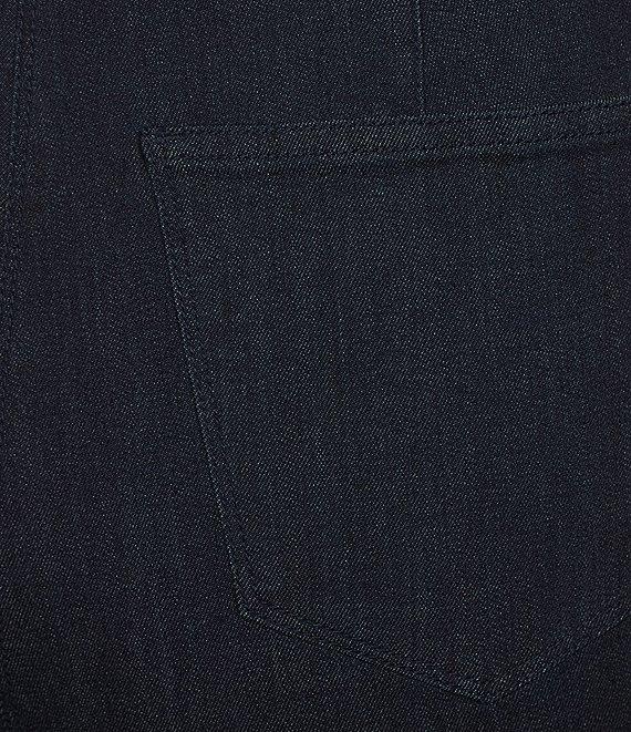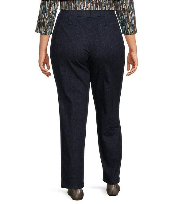 From Intro Plus, this pants feature: Denim fabrication Flat front silhouette Elasticized waistband Straight leg silhouette Faux front pockets Functional back patch pockets Seaming detail Pull-on construction Approx. 30" inseam Cotton/rayon/polyester/spandex Machine wash/tumble dry Imported.
