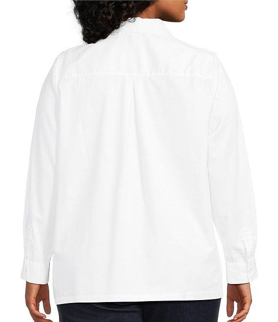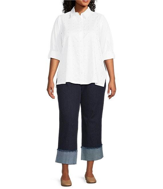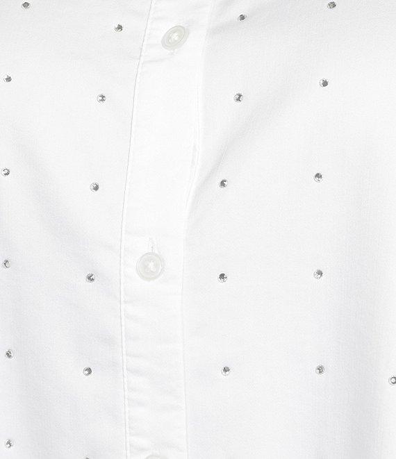 From Intro Plus, this shirt features: Stretch cotton woven fabrication Point collar Long roll-tab sleeves Crystal embellished front detail Straight hemline Button-front closure Approx. 27.625" length Cotton/polyester/spandex Machine wash tumble dry Imported.