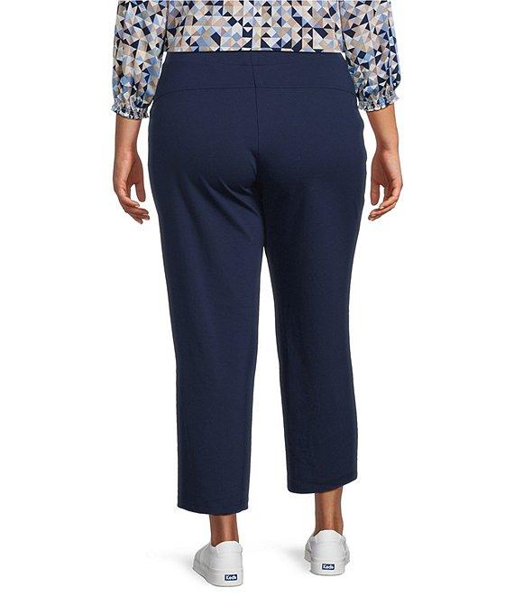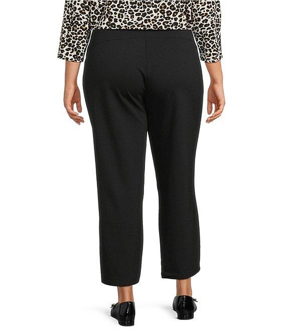 From Intro Plus, these pants feature: Double knit fabrication Elastic waistband Side pockets Traveler relaxed leg Shaped back yoke lifts and sculpts Straight hemline Pull-on construction Approx. 27" inseam Rayon/nylon/spandex Machine wash/tumble dry Imported.