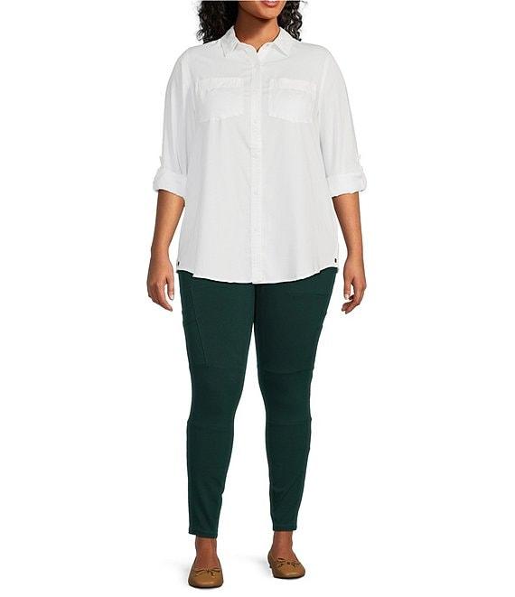 From Intro Plus, this legging features: Knit fabrication Wide waistband Straight leg Tummy control waist Patch pockets, cargo pockets at legs Pull-on construction Approx. 27.5" inseam Shell: cotton/spandex; inner panel: spandex Machine wash/tumble dry Imported.