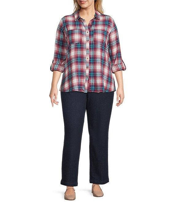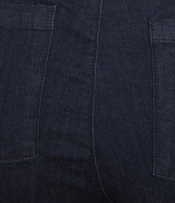 From Intro Plus, these pants feature: Denim fabrication Straight leg silhouette Flat front silhouette Elasticized waistband Faux front pockets Functional back patch pockets Straight hem Pull-on construction Approx. 29.5" inseam Cotton/rayon/polyester/spandex Machine wash/tumble dry Imported.