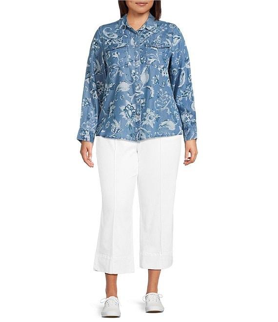 From Intro Plus, this shirt features: Woven fabrication Point collar neckline Long sleeves with buttoned cuffs printed Chest pockets Shirttail hem Center front snap button closure Approx. 27.25" length Lyocell Machine wash Imported.