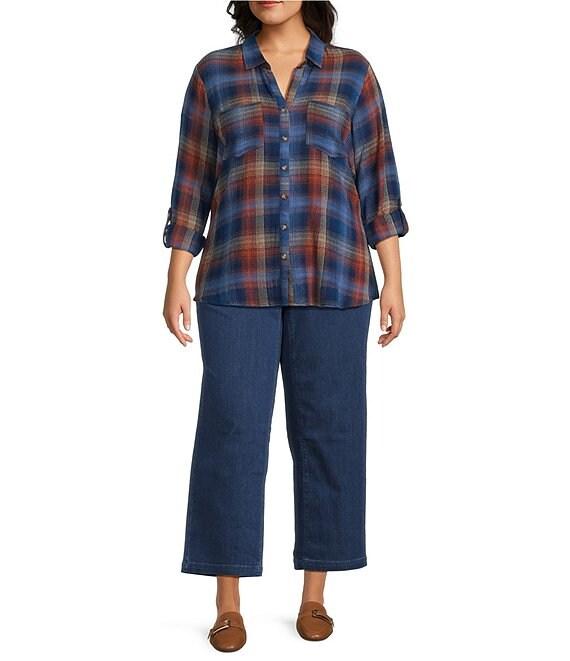 Intro Plus Size Woven Pucker Plaid Blue Quartz Point Collar 3/4 Rolled-Tab Sleeve Button Front Shirt