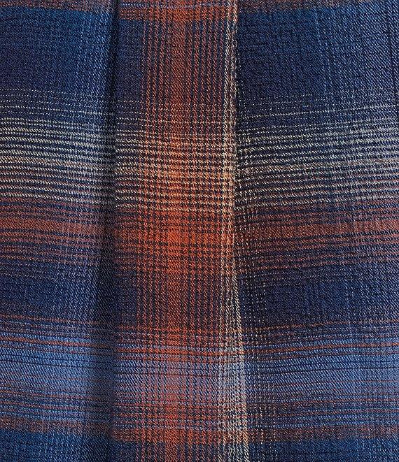 From Intro Plus, this shirt features: Woven pucker plaid fabrication Point collar 3/4 rolled-tab sleeves Two functional patch pockets Split back with button detail Button-front closure Approx. 29.5" length Rayon/polyester/elastane Machine wash/ line dry Imported.