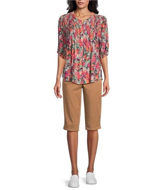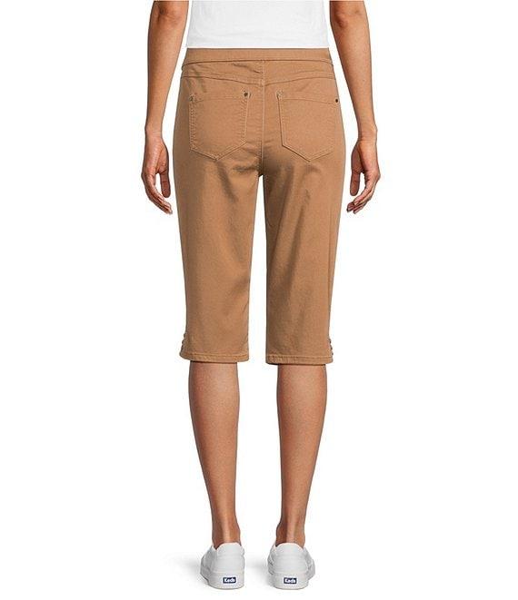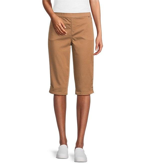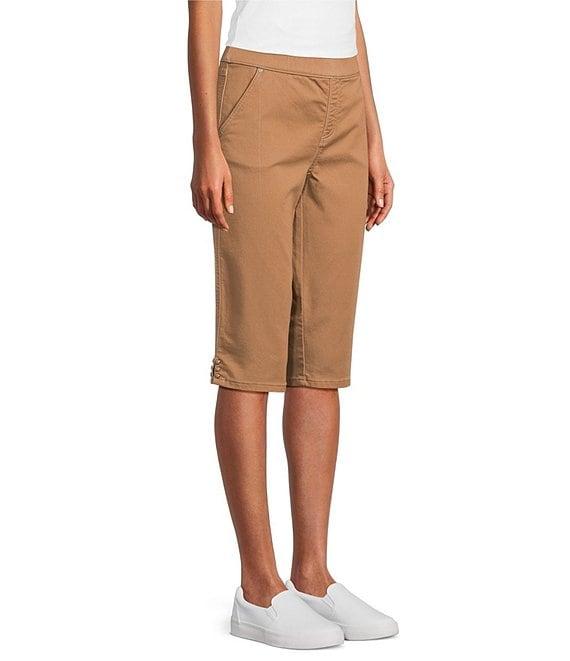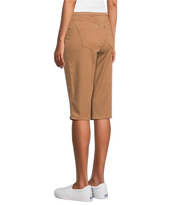 From Intro Plus, these shorts feature: "Fauxdel" sateen power stretch fabricationFlat front silhouetteWaistbandtummy panel Heatseal trim embellished at side hemPull-on constructionApprox. 16" inseam Polyester/cotton/rayon/spandexMachine wash/tumble dry Imported.