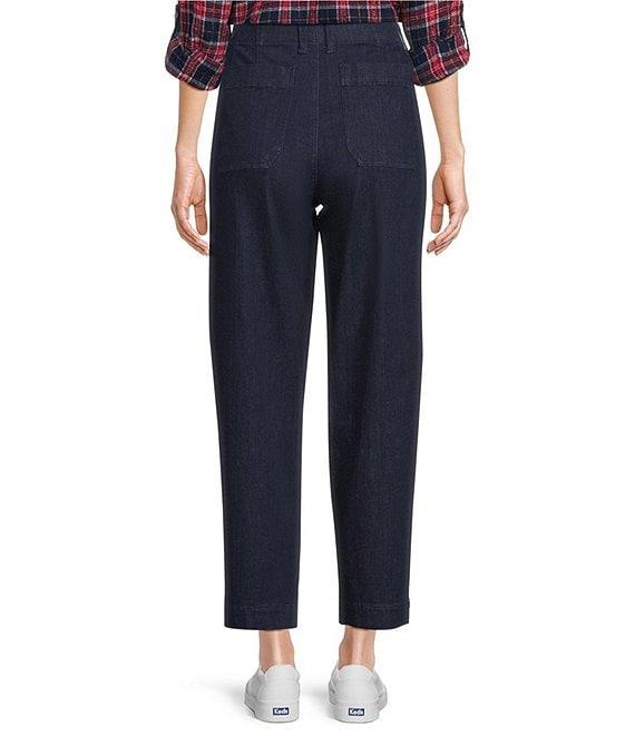 From Intro, these pants feature: Freedom denim fabrication Hollywood waist Belt loops Functional front slash pockets, functional back patch pockets Hidden inner tummy control panel Relaxed slight barrel shaped leg Crop length Button/zip closure Approx. 27" inseam Cotton/rayon/polyester/spandex Inner panel: polyester/spandex Machine wash cold Imported.