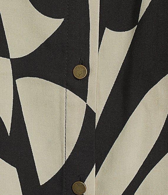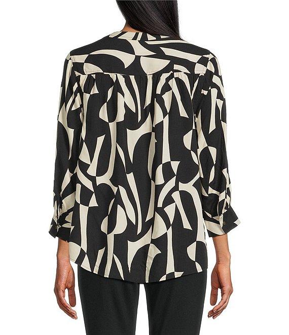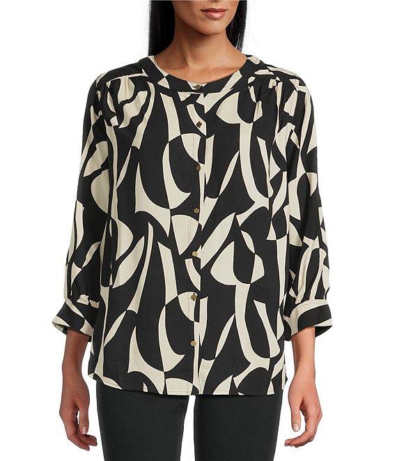 From Intro, this shirt features: Soft puckered fabrication Round band collar neckline 3/4 sleeves with cuffs Large geo print Easy drape Straight hem Button-front closure Approx. 27" length from center back Rayon Machine wash / line dry Imported.