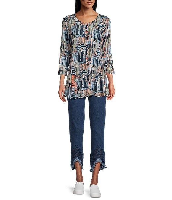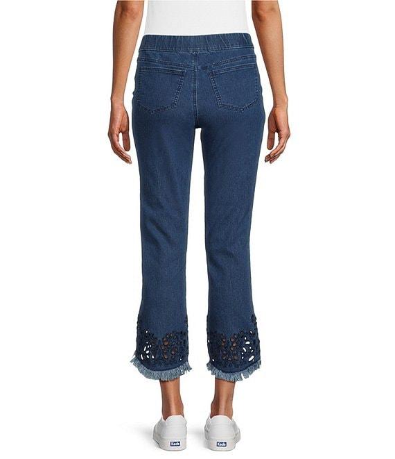 From Intro, these pants feature: Stretch fabrication Elastic waistband Faux front pockets, Functional back patch pockets Embroidered tulip hem with frayed edge Ankle length Pull-on construction Approx. 26.5" inseam Cotton/polyester/spandex Machine wash/tumble dry Imported.