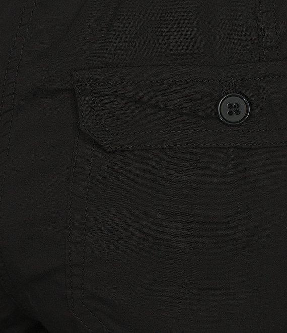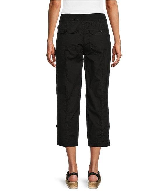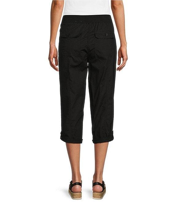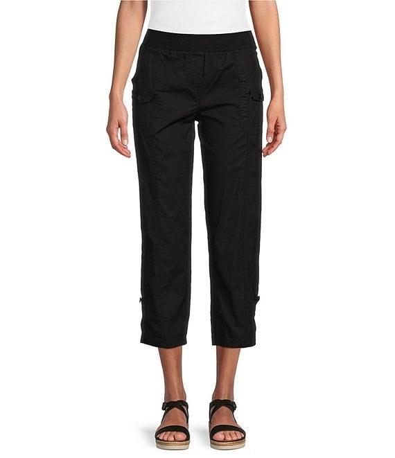 From Intro, these pants feature: Stretch poplin fabrication Straight leg silhouette Soft rib knit comfort waist Functional front & back pockets Front cargo pockets Adjustable length Pull-on construction Approx. 24"inseam Cotton/spandex Machine wash/tumble dry Imported.