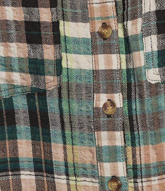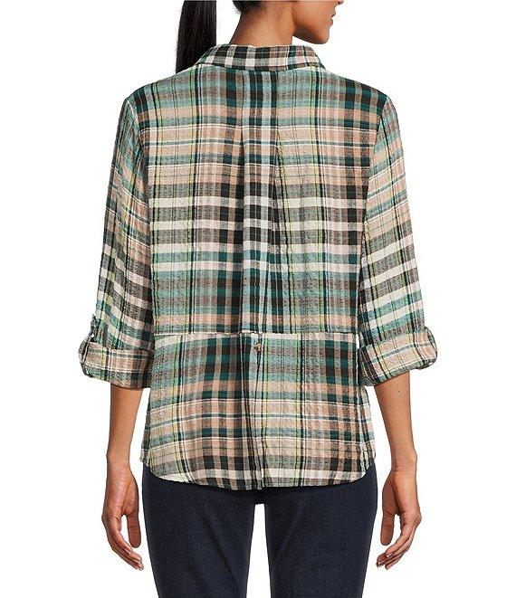 From Intro, this shirt features: Woven pucker plaid fabrication Point collar 3/4 rolled-tab sleeves Two functional patch pockets Split back with button detail Button-front closure Approx. 26.75" length Rayon/polyester/elastane Machine wash/ line dry Imported.