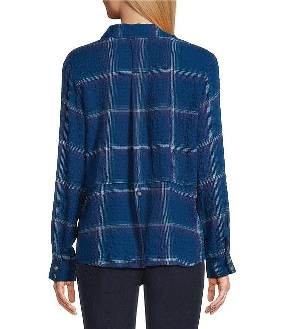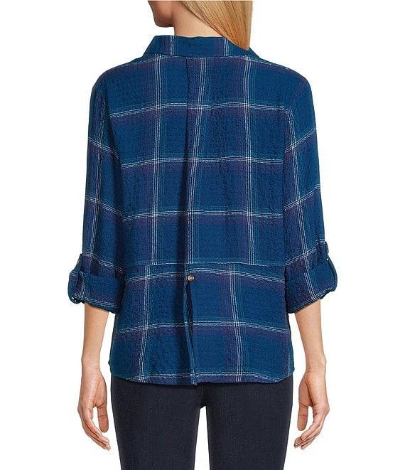 From Intro, this shirt features: Woven pucker plaid fabrication Point collar 3/4 rolled-tab sleeves Two functional patch pockets Split back with button detail Button-front closure Approx. 26.75" length Rayon/polyester/elastane Machine wash/ line dry Imported.